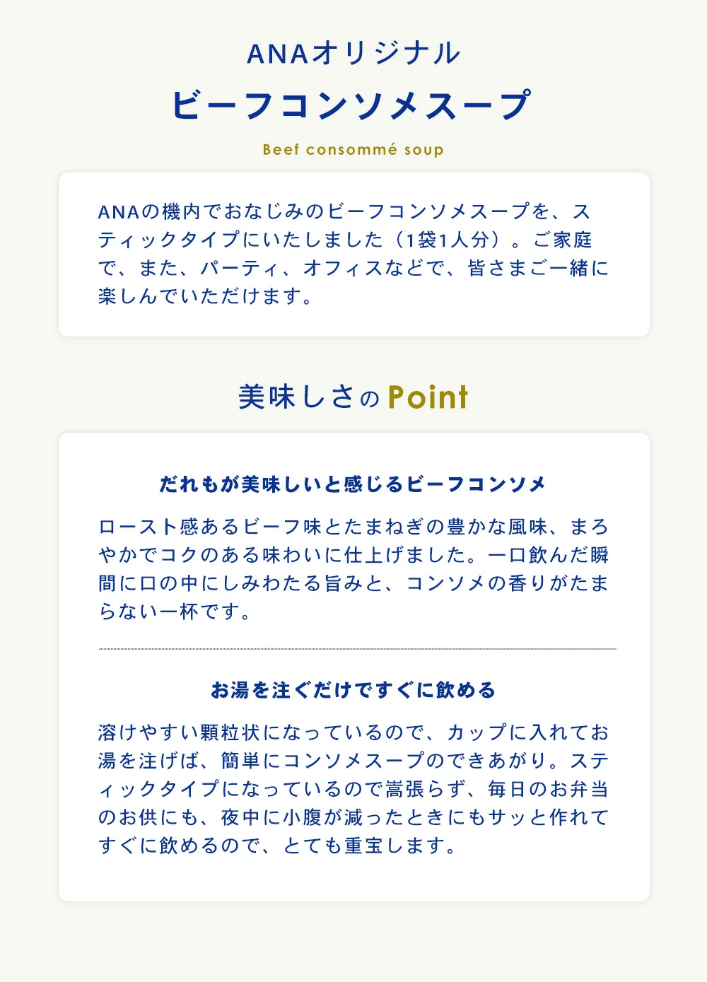 ANAの機内でおなじみのビーフコンソメスープを、スティックタイプにいたしました(1袋1人分)。