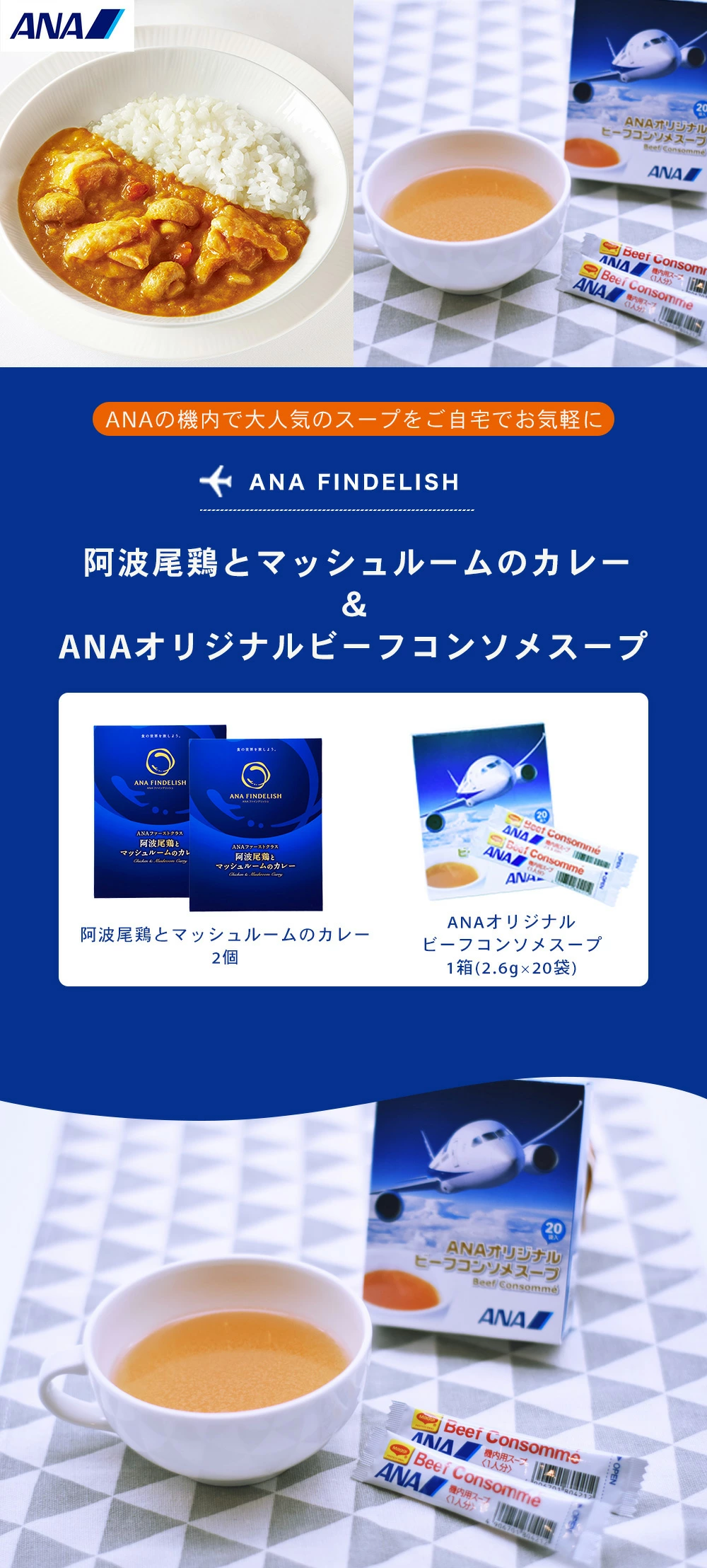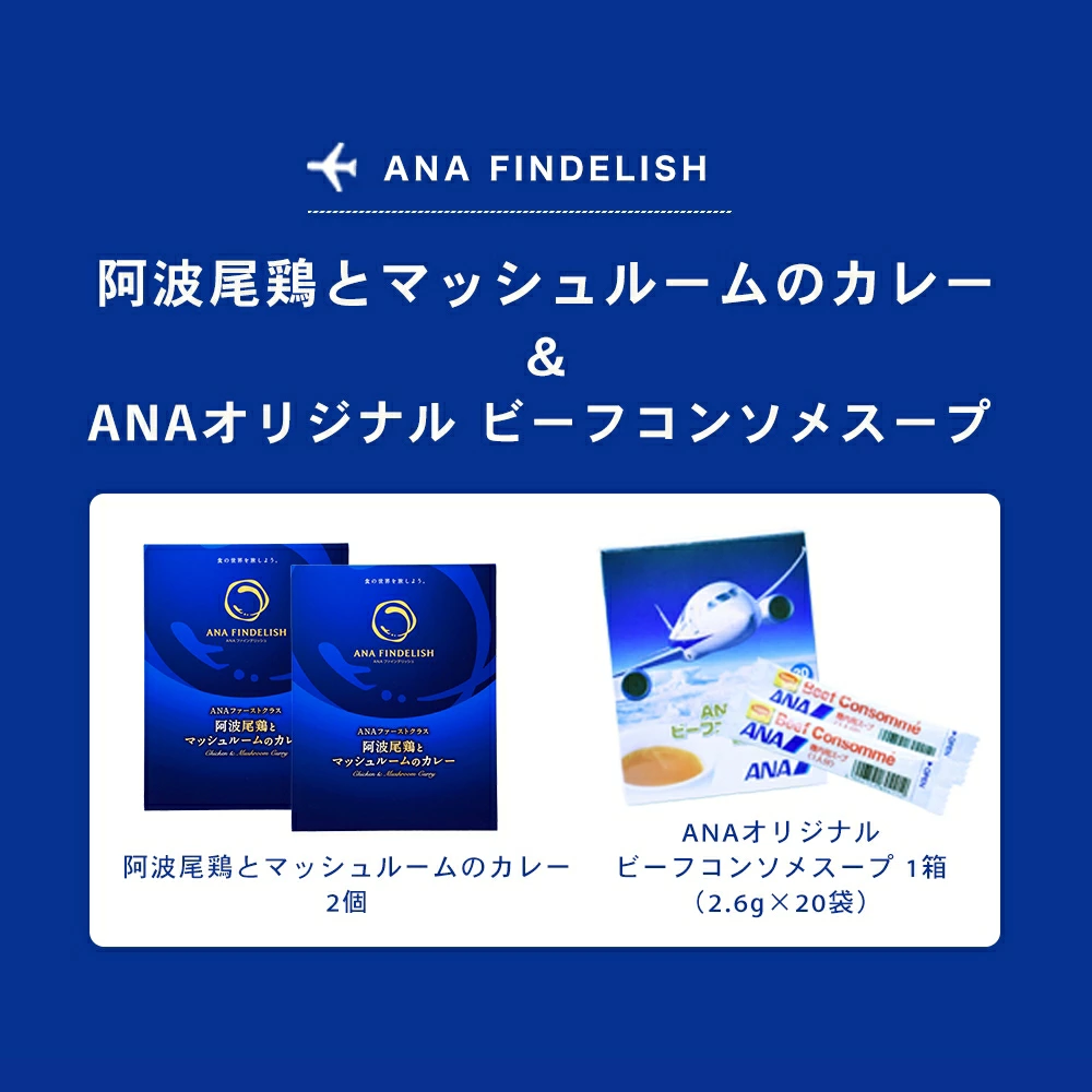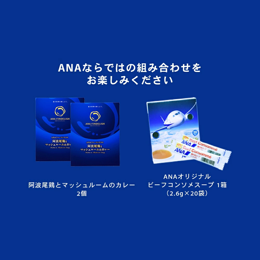 【ANA FINDELISH】 阿波尾鶏とマッシュルームのカレー 2個+ ANAオリジナルビーフコンソメスープ セット 皆様からのお声にお応えして待望のANAオリジナルビーフコンソメスープの お取り扱いを開始いたしました! ANAならではのセットをお楽しみください。 ■内容量 ・阿波尾鶏とマッシュルームのカレー 2個 ・ANAオリジナルビーフコンソメスープ 1箱(2.6g×20袋)