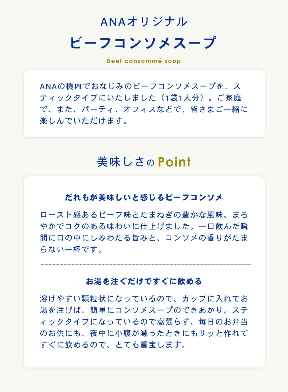 ANAの機内でおなじみのビーフコンソメスープを、スティックタイプにいたしました(1袋1人分)。