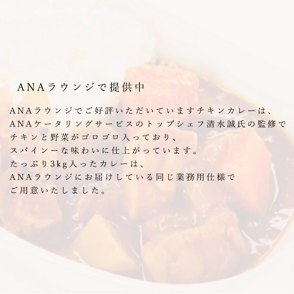 ANAラウンジで提供中!!オリジナルチキンカレー 3kg袋 ANAラウンジでご好評いただいていますチキンカレーは、ANAケータリングサービスのトップシェフ清水 誠の監修で、チキンと野菜がゴロゴロ入っており、スパインーな味わいに仕上がっています。たっぷり3k入ったカレーは、ANAラウンジにお届けしている同じ業務用仕様でご用意いたしました。