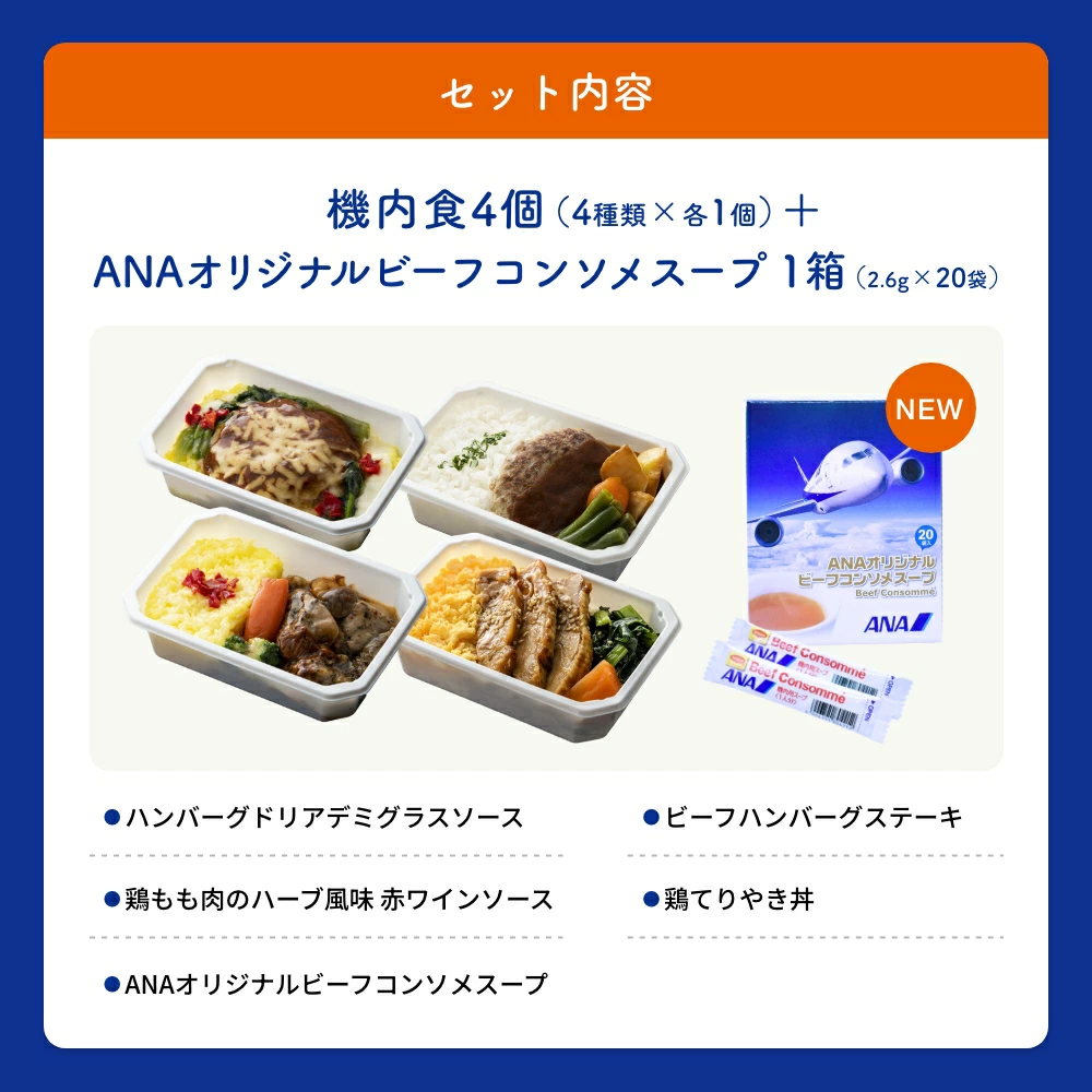 お待たせいたしました!待望のANAオリジナルビーフコンソメスープセット登場! お客様からのお声をいただき、「ANAオリジナルビーフコンソメスープ」のお取り扱いを開始いたします! 【ANA機内満喫シリーズ】 機内食4個+ANAオリジナルビーフコンソメスープセット (機内食4個+ビーフコンソメスープ1箱) ■内容量 機内食 4個(4種×1個)+ANAオリジナルビーフコンソメスープ1箱(2.6g×10本) 機内食セットメニュー:各1個ずつ ・ビーフハンバーグステーキ ・ハンバーグドリア デミグラスソース・鶏もも肉のハーブ風味 赤ワインソース ・鶏てりやき丼 ANAの機内食の味をそのままにお届けする【ANA's Sky Kitchen】は、お子様からご高齢者など幅広い方にご利用いただける商品です。 レンジで温めるだけの簡単調理で贅沢グルメと共に旅気分が味わえます。 冷凍で保存可能ですので、一人暮らしの方や単身赴任の方、リモートワークの方などにもおすすめです。