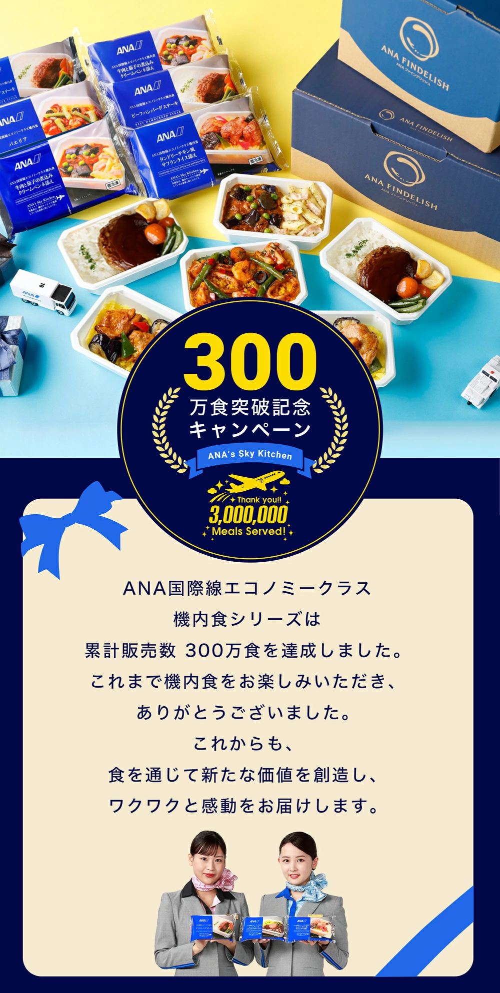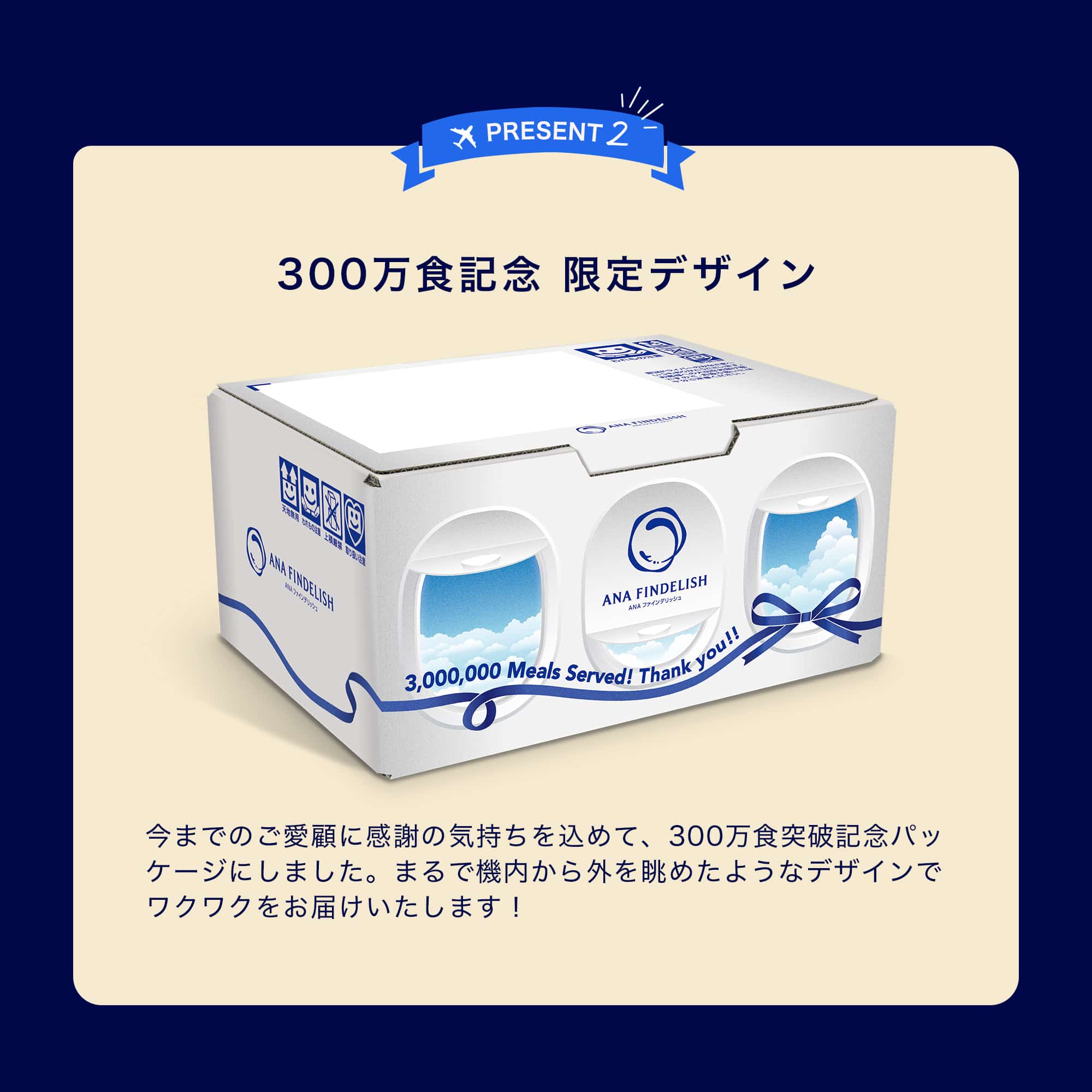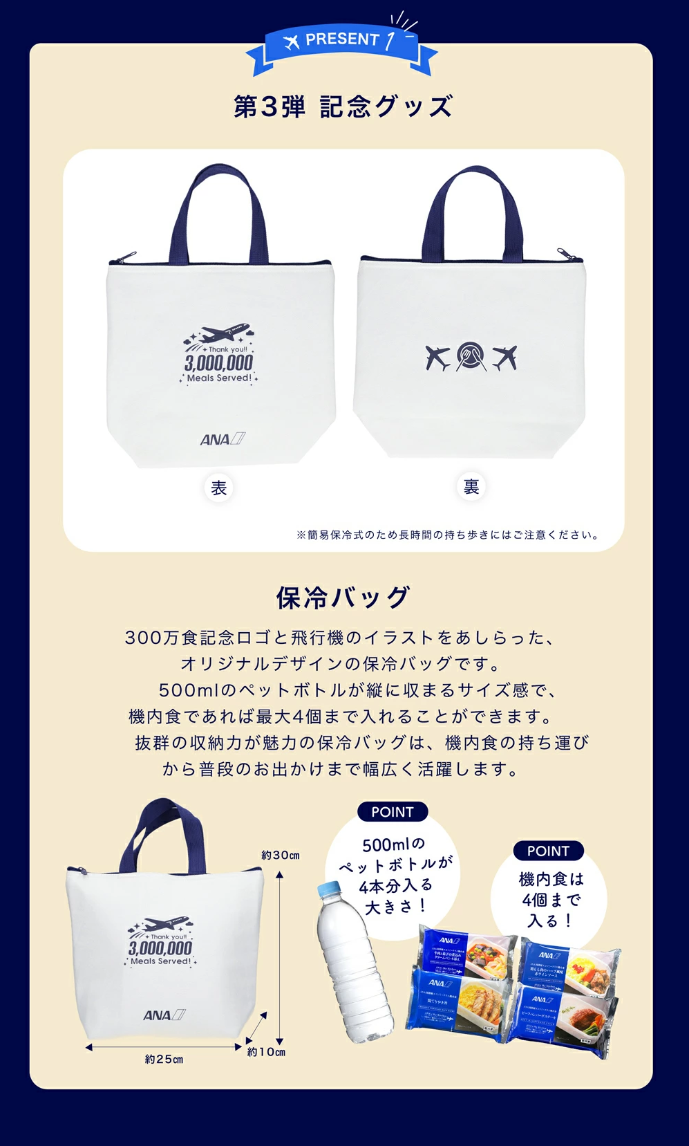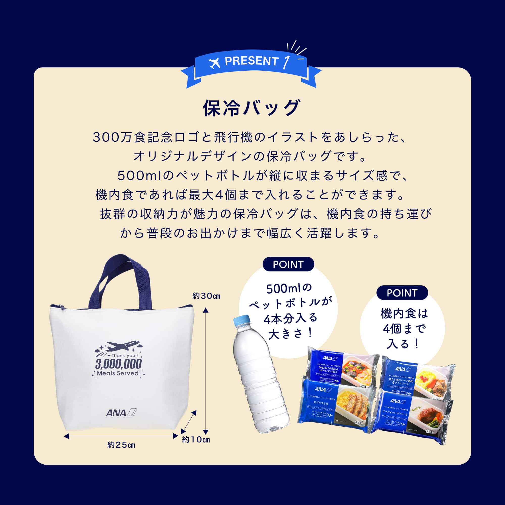 皆様にご愛顧いただき、300万食を突破いたしました! 300万食突破記念キャンペーン 【300万食突破記念】第3弾 ルンルン!おでかけテイクオフセット ■セット内容 保冷バッグ1個 (サイズ タテ:約30cm、ヨコ:約25cm、マチ:約10cm) 機内食8個(4種類×2個ずつ) ・ビーフハンバーグステーキ ・牛肉と茄子の煮込み クリームペンネ添え ・鶏もも肉のハーブ風味 赤ワインソース ・鶏てりやき丼 ANAの機内食の味をそのままにお届けする【ANA's Sky Kitchen】は、お子様からご高齢者など幅広い方にご利用いただける商品です。 レンジで温めるだけの簡単調理で贅沢グルメと共に旅気分が味わえます。 冷凍で保存可能ですので、一人暮らしの方や単身赴任の方、リモートワークの方などにもおすすめです。