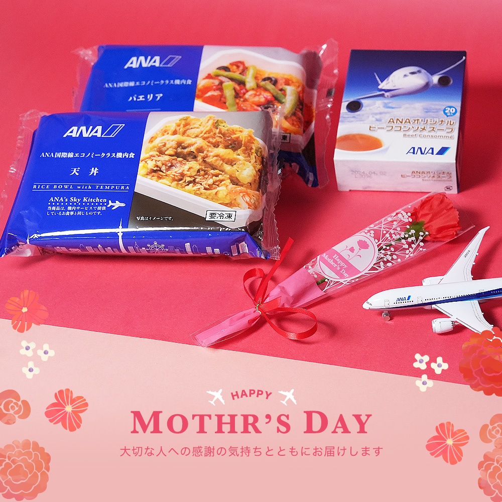 母の日のギフトにぴったり!! ANAの旅気分を満喫できる機内食とスープのセットをご用意いたしました。 ※この商品は、5月7日以降発送となります。 【母の日】いつもありがとう便 ANA機内食+ANAオリジナルビーフコンソメスープセット (機内食2個+ビーフコンソメスープ1箱) <内容量> ■機内食 2個(2種×各1個) ・パエリア ・天丼 ■ANAオリジナルビーフコンソメスープ:1箱(2.6g×20袋) ■オリジナルメッセージカード:1枚 ■カーネーション:1本 ※造花となります