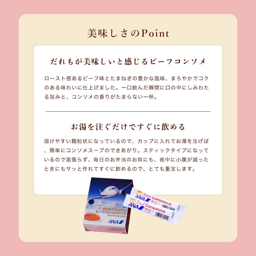 <ANAオリジナルビーフコンソメスープ(1本:2.6g)> ●原材料名:食塩(国内製造)、乳糖、ビーフエキス、でん粉、砂糖、酵母エキス、牛脂、粉末しょうゆ(大豆・小麦を含む)、たまねぎ、シーズニングパウダー、とうもろこし油/調味料(アミノ酸等)、カラメル色素、乳酸、香辛料抽出物、酸化防止剤(ローズマリー抽出物)