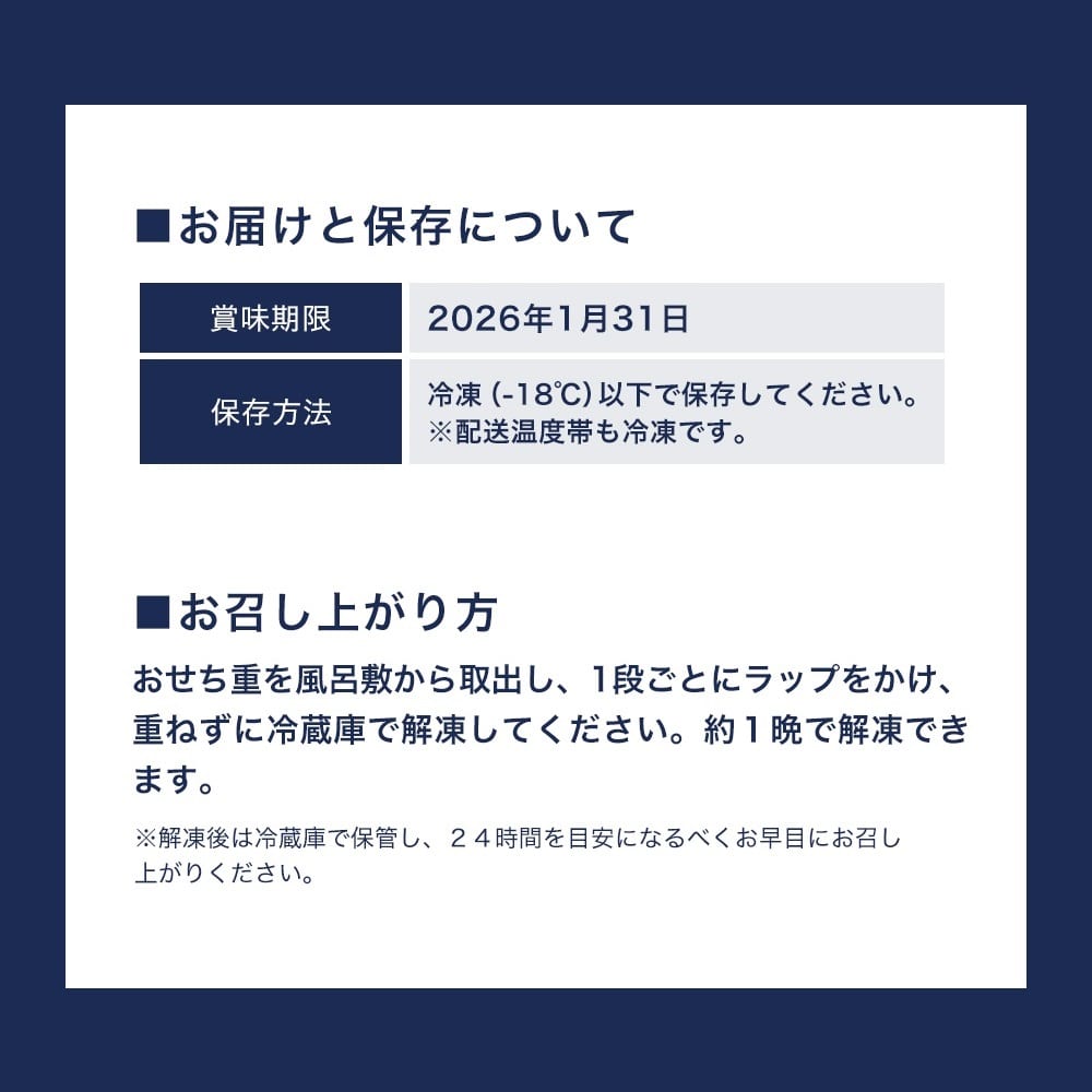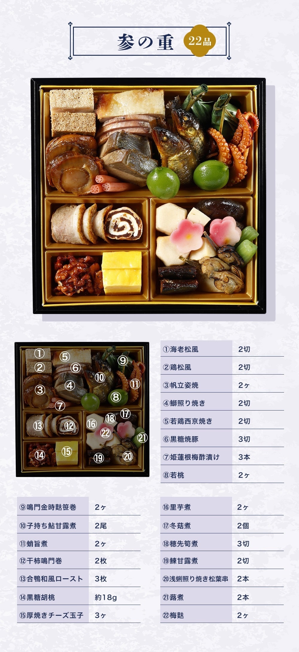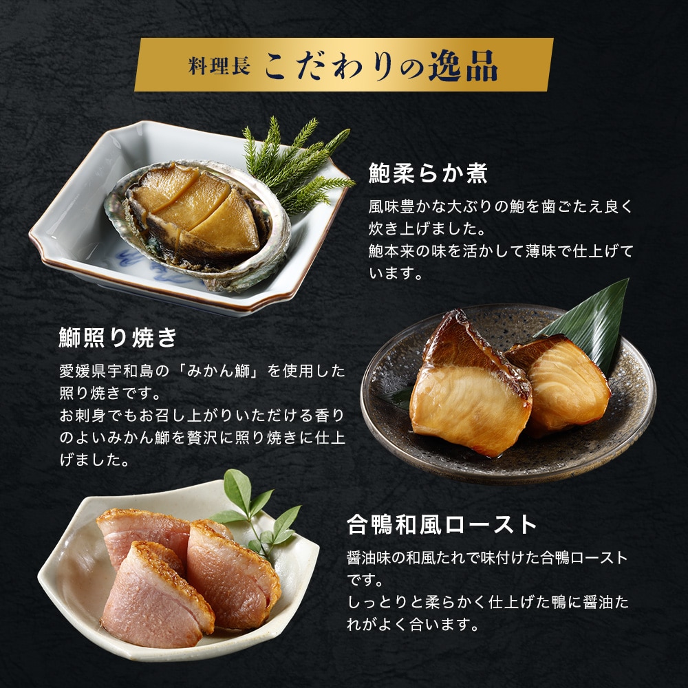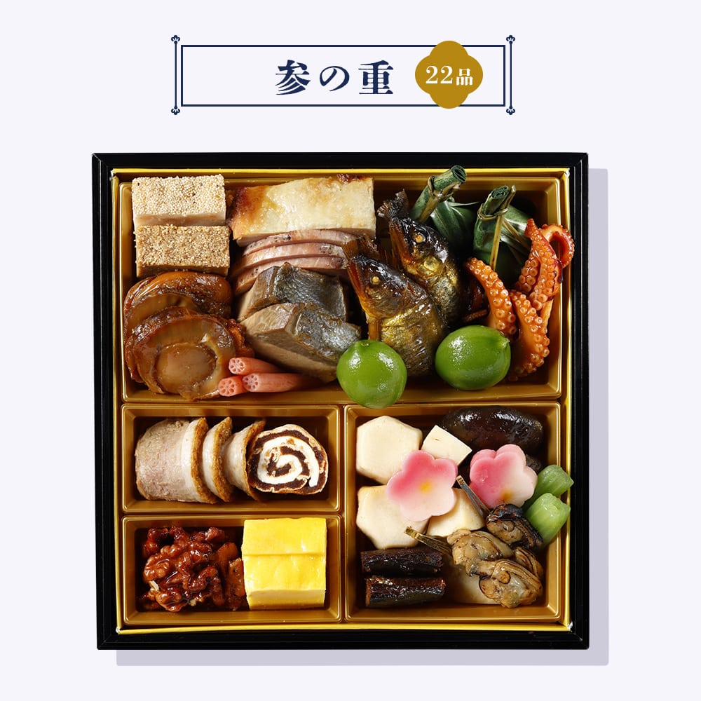 お煮しめ(里芋煮(里芋:中国)、穂先筍煮、ふき煮、梅生麩煮、椎茸煮)、子持ち鮎甘露煮(子持ち鮎、砂糖、しょうゆ、麦芽糖水あめ、発酵調味料、清酒、寒天)、ぶり照焼き(ぶり、しょうゆ、砂糖、発酵調味料、食塩、魚醤、麦芽エキス、酵母エキス、魚介エキス)、若鶏西京焼き(鶏肉、白みそ、本みりん、食塩、水あめ、食用油脂)、合鴨和風ロースト(あい鴨肉、しょうゆ、ぶどう糖果糖液糖、発酵調味料、魚介エキス、たん白加水分解物、醸造酢)、厚焼きチーズ玉子:卵加工品(卵黄加工品、魚肉すり身、砂糖、油脂加工品 、ナチュラルチーズ、コーンスターチ、食用なたね油脂、牛乳、食塩)、帆立照焼き(ほたて、照りたれ、しょうゆ、発酵調味料、砂糖)、黒糖焼豚(豚肉、糖類(砂糖(黒砂糖、砂糖)、ぶどう糖)、食塩、香辛料、コーヒー抽出液)、蛸旨煮、鶏松風:鶏肉加工品(鶏肉、魚肉すり身、砂糖、味噌、鶏卵、パン粉、けしの実、しょうゆ、清酒、でん粉、食塩、みりん、粉山椒)、若桃甘露煮、鳴門金時あん入り生麩笹包み、干柿鳴門巻:干し柿加工品、黒糖くるみ(砂糖類(上白糖、粗糖、黒糖)、くるみ、食用油脂、水あめ)、鰊甘露煮、海老松風:魚肉加工品、アサリ照焼き、茎蓮根梅酢漬け/トレハロース、ソルビット、加工デンプン、増粘剤(加工デンプン、キサンタンガム)、調味料(アミノ酸等)、pH調整剤、着色料(カラメル、クチナシ、紅麹、赤ダイコン、赤3、赤106、赤102、黄4、青1)、酒精、グリシン、酢酸Na、乳酸Ca、セルロース、酸味料、香料、ミョウバン、酸化防止剤(V.C)、リン酸塩(Na)、焼成Ca、保存料(ポリリジン)、トウガラシ抽出物、乳化剤、発色剤(亜硝酸Na)、甘味料(ステビア、カンゾウ、スクラロース)、V.B1、安定剤(増粘多糖類)、(一部に小麦・卵・乳成分・えび・くるみ・アーモンド・さば・大豆・鶏肉・豚肉・もも・ゼラチン・魚介エキス(魚介類)を含む)