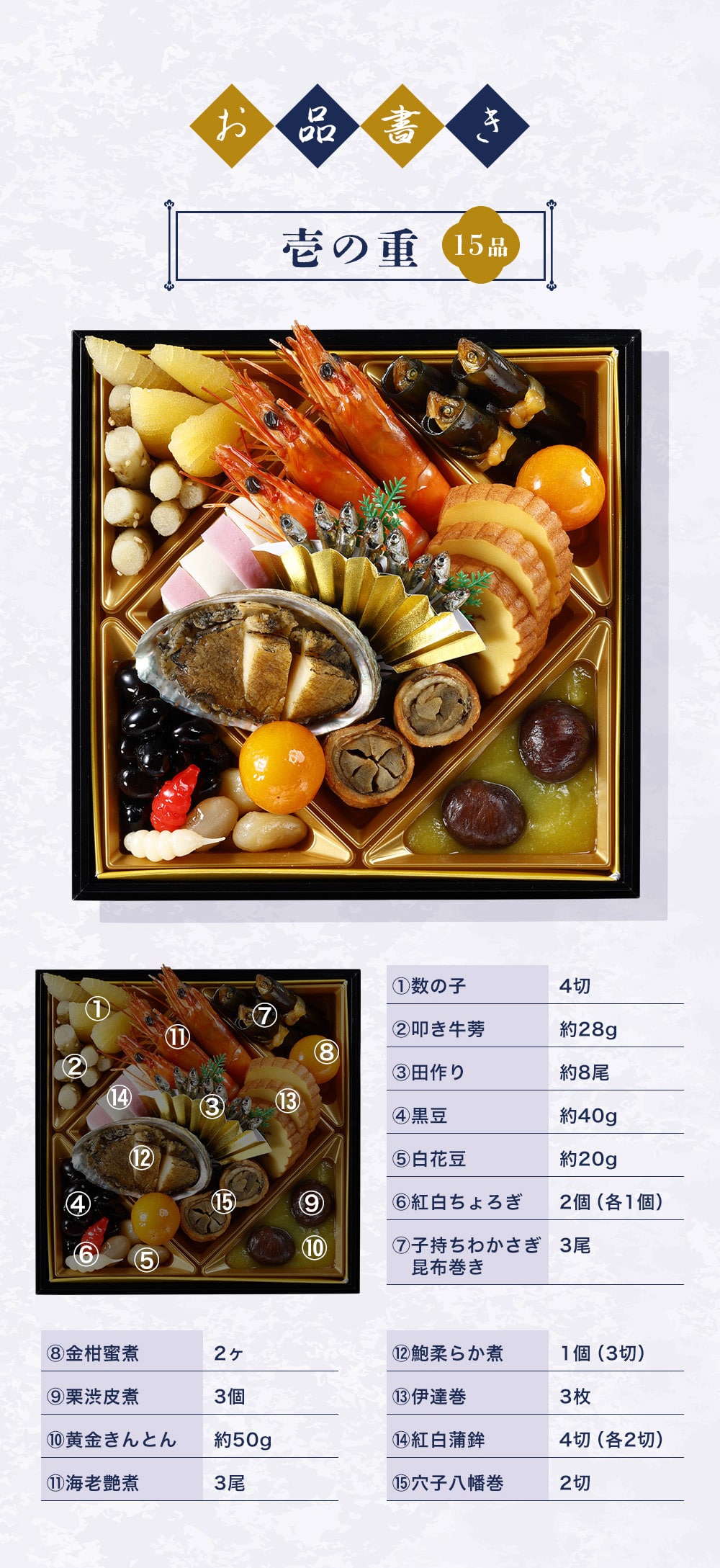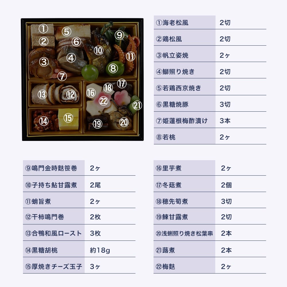 海老艶煮(ブラックタイガー海老(タイ)、砂糖、還元水あめ、しょうゆ、みりん、食塩)、栗きんとん(栗渋皮甘露煮、黄金きんとん(さつまいも、砂糖、オリゴ糖、寒天加工品))、伊達巻:魚肉練り製品(鶏卵、魚肉すり身、砂糖、水あめ、発酵調味料、食塩、はちみつ、ローヤルゼリー)、紅白かまぼこ:魚肉練り製品(魚肉すり身、砂糖、でん粉、卵白、米油、食塩、大豆たん白、みりん、魚介エキス、椎茸だし)、黒豆煮(砂糖、黒大豆、赤酒、みりん、ワイン、食塩)、穴子八幡巻(あなご、ごぼう、糖類(果糖ぶどう糖液糖、砂糖)、しょうゆ、発酵調味料、食塩、カキエキスパウダー、酵母エキス、たん白加水分解物、香辛料)、子持ちわかさぎ昆布巻(昆布、焼き子持ちわかさぎ、砂糖、しょうゆ、かんぴょう、水あめ、寒天)、鮑柔らか煮(エゾアワビ、しょうゆ、かつおエキス、ブドウ発酵調味液、発酵調味料、たん白加水分解物、食塩、還元でん粉糖化物)、金柑蜜煮、味付け数の子(にしん卵、しょうゆ、砂糖混合異性化液糖、還元水あめ、発酵調味料、魚介エキス、たん白加水分解物、食塩)、叩き牛蒡(ごぼう、砂糖、食塩、異性化液糖、ごま、なたね油、かつお節エキス、みりん)、白いんげん豆煮、田作り:いわし佃煮、紅白ちょろぎ酢漬け/ソルビット、加工デンプン、調味料(アミノ酸等)、トレハロース、pH調整剤、酒精、増粘剤(加工デンプン、増粘多糖類)、乳化剤、着色料(クチナシ、カラメル、紅麹、カルミン酸、赤102、黄4)、酸味料、グリシン、リン酸塩(Na)、香辛料抽出物、漂白剤(次亜硫酸Na)、香料、保存料(ソルビン酸K) 、(一部に小麦・卵・えび・あわび・さば・大豆・鶏肉・ごまを含む)