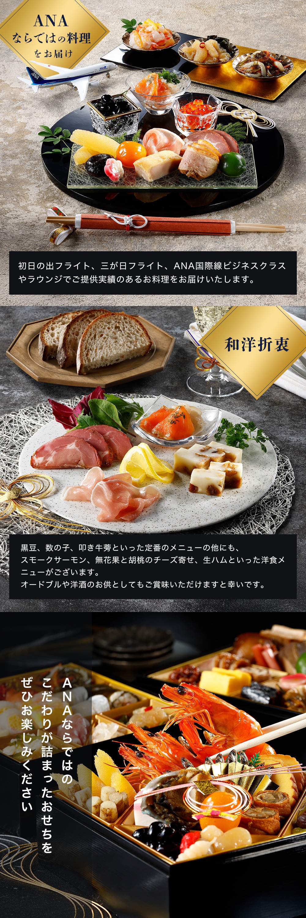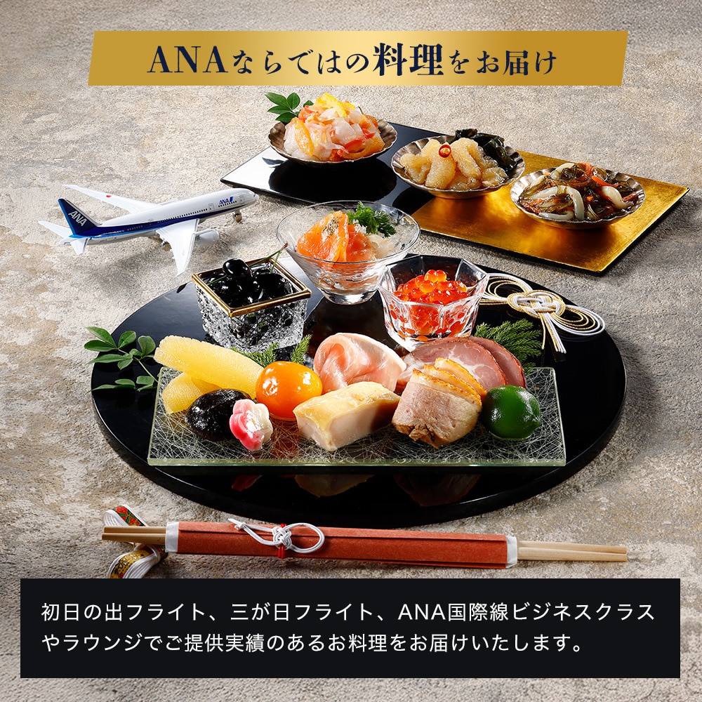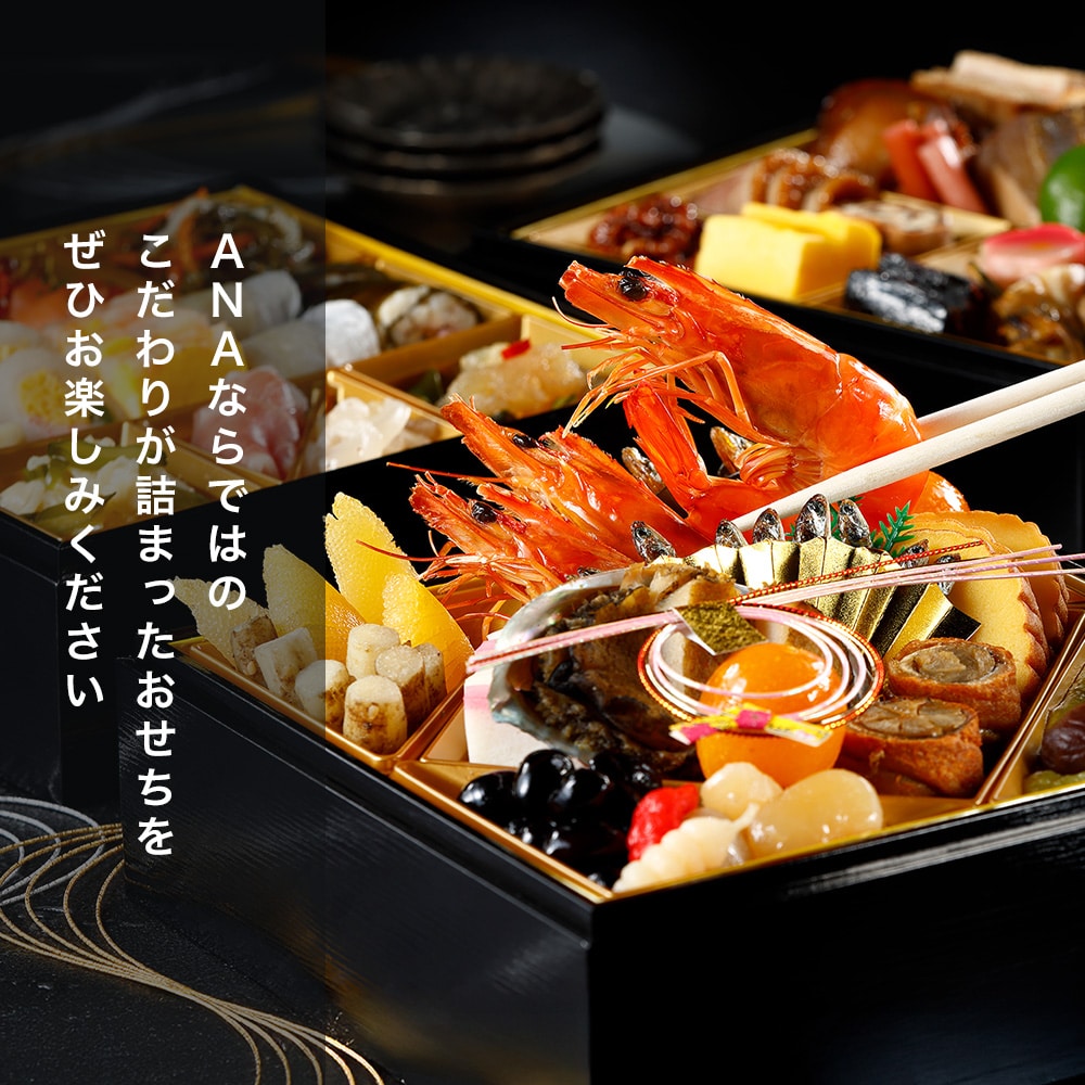 新春年明けお節、オードブルなどでもお楽しみいただけます。 初日の出フライト等でご提供しているメニューも入っております。 ANAでしか生み出せない特別な御節料理です。 ※こちらの商品の賞味期限は1月31日となります。