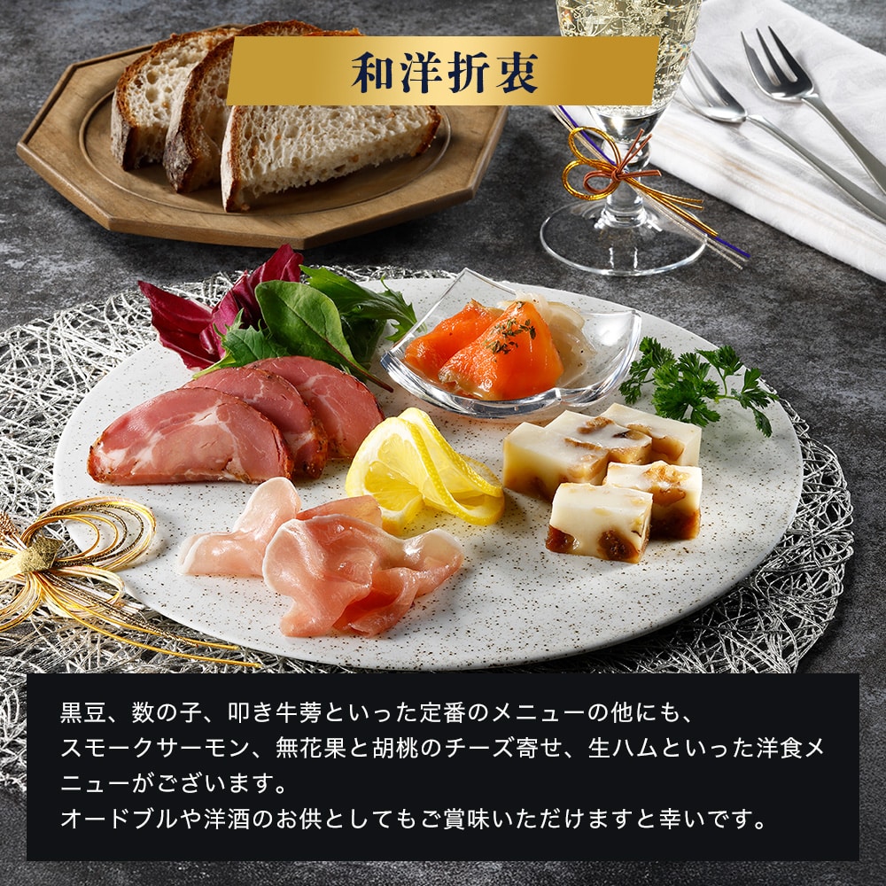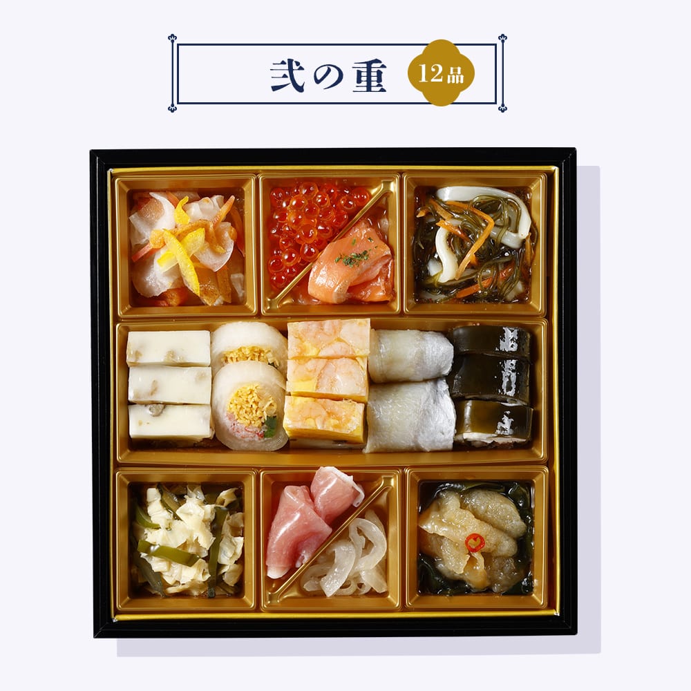 いか松前漬け(昆布、いか、にんじん、白しょうゆ、砂糖、還元水あめ、食塩、かつおエキス調味料、たん白加水分解物、唐辛子、醸造酢)(国内製造)、蕪と柿のなます(野菜(かぶ、柿、金時にんじん)、醸造酢、砂糖、ゆず皮、食塩)、いちじくとくるみのチーズ寄せ(乾燥イチジク、砂糖、ナチュラルチーズ、くるみ、乳等を主原料とする食品)、花咲海月酢漬け(くらげ酢漬け(味付けくらげ、しょうゆ、みりん、砂糖、食塩、かつお風味調味料、ごま油、米酢)、水戻しわかめ、唐辛子)、湯葉の磯和え(茎わかめ加工品、湯葉、醸造酢)、生ハム玉ねぎマリネ(玉ねぎマリネ(玉ねぎ、植物油脂、醸造酢、ぶどう糖果糖液糖、食塩、香辛料、濃縮レモン果汁)、生ハム)、海老寄せ:魚肉加工品(魚肉すり身、海老、ゆで卵、液卵白、半固体状ドレッシング、いか、砂糖、きくらげ、食塩、にんじん)、龍皮巻:白身魚昆布巻(コガネカレイ、味付け生姜、味付け昆布、調味酢、砂糖、ゼラチン、発酵調味料、食塩)、サーモン野菜マリネ(玉ねぎマリネ、トラウトサーモンスモーク、乾燥パセリ)、かにきぬた巻(大根、味付け紅ズワイガニ、錦糸卵、水煮わらび、しょうが甘酢漬け、醸造酢、砂糖、発酵調味料)、いくらしょうゆ漬け、小鯛ささ漬け/ソルビット、調味料(アミノ酸等)、ゼラチン、酒精、増粘剤(加工デンプン、増粘多糖類)、加工デンプン、トレハロース、pH調整剤、グリシン、酸味料、着色料(カロチノイド、銅葉緑素、赤102、赤106)、保存料(ソルビン酸(K))、リン酸塩(Na、K)、乳化剤、香料、甘味料(ステビア、カンゾウ)、酸化防止剤(V.C)、香辛料抽出物、焼成Ca、発色剤(亜硝酸Na)、トウガラシ抽出物、カラシ抽出物、漂白剤(次亜硫酸Na)、安定剤(増粘多糖類)、(一部に小麦・卵・乳成分・えび・かに・くるみ・いか・いくら・ごま・さけ・大豆・豚肉・ゼラチン・りんごを含む)