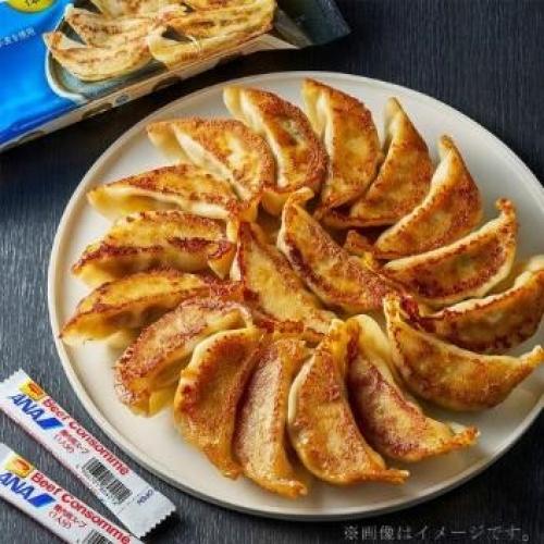 【焼き餃子】1.フライパンを熱し油を引きます。2.中火にし、凍ったまま餃子を並べて約70mlのお湯でよく溶かしたコンソメスープまたは、水、お湯を入れてください。3.蓋をして約4~5分、水分がほとんどなくなるまで蒸し焼きにしてください。4.水分がほとんどなくなったらフタを取り弱火でフライパンをこまめに動かしながら焼きます。5.焼き面にこんがり焼き色がついたらお皿に盛りつけて完成です。※ポイント 餃子が焦げ付かないように蓋をしたままこまめにフライパンを動かしてください。【水餃子】1.大きめの鍋に八分目ほど、水を入れ強火で沸騰させます。完全に沸騰したら餃子を入れ、なべ底につかないよう優しくかき混ぜます。2.噴きこぼれそうになったら弱火にし、餃子が膨れて浮き上がるまで茹でます。3.6分ほど茹でると餃子が浮き上がってきます。4.大きめの器にコンソメ顆粒を入れ、150mlの熱湯を注ぎコンソメスープを作ります。5.そこへ茹で上がった餃子を入れて完成です。