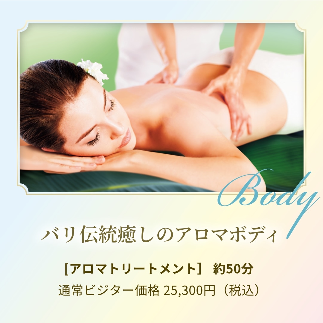 ●男性の方はメンズコース設置サロンにて「心ほどけるプレミアム美顔(約70分)」をご利用いただけます。「バリ伝統癒しのアロマボディ(約50分)」は桜庵(河口湖)でのみご利用いただけます