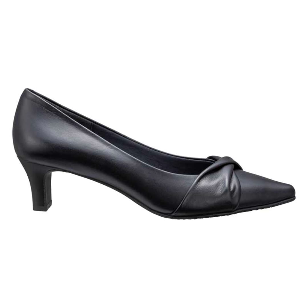 すっきりとしたポインテッドスクエアトウに、ドレープデザインをのせることで女性らしい柔らかな印象を与えてくれる1足。