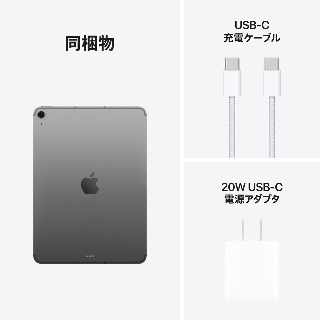 同梱物 11インチiPad Air、USB-C充電ケーブル、20W USB-C電源アダプタ