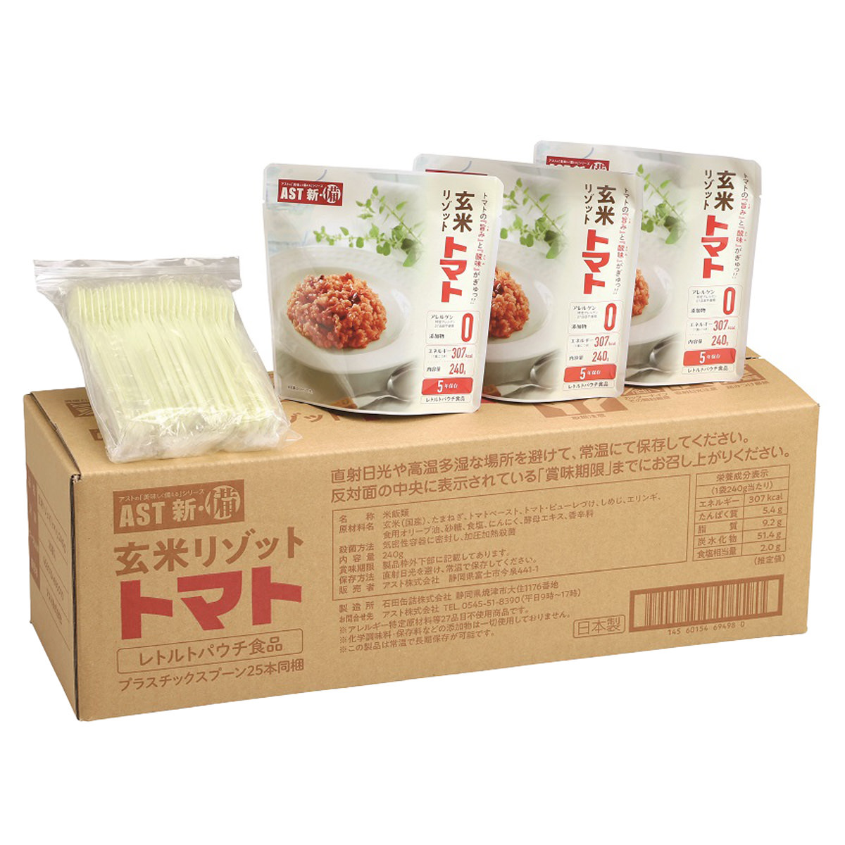 「レトルト AST 新 備 玄米リゾット トマト」は、あたためや調理不要で常温でもすぐに食べられるレトルトパウチ食品です。玄米の使用により、食物繊維、ビタミンB1、Eをプラス。水分調整と玄米でお米の粒をしっかりキープし、長期保存しても良い食感を保ちます。トマトの旨みと酸味を出し、おいしく仕上げた玄米リゾットです。アレルゲン28品目不使用、添加物ゼロ。パウチは非常時、お皿がなくても食べやすいスタンディングタイプです。ピンホールが発生しにくい4層パウチを採用しています。便利なプラスチック製のスプーンが付属します。常温で長期保存ができるので、非常食、防災食、災害備蓄などにご活用ください。