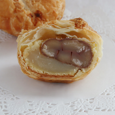仙北市の特産品である「日本一大きな栗」西明寺栗をまるごとパイで包みました。和栗本来の風味を最大限にいかすために、すべての工程を手作りで行っています。大きい西明寺栗の鬼皮をむき餡子とカステラと栗を一緒にパイで包んであるので、そのまま食べればしっとりお饅頭風、オーブンで5分焼けばサクサクした食感に。栗の甘みがたまりません!厳選した安全な材料だけを使っているのでリピーターが多い大満足の商品。