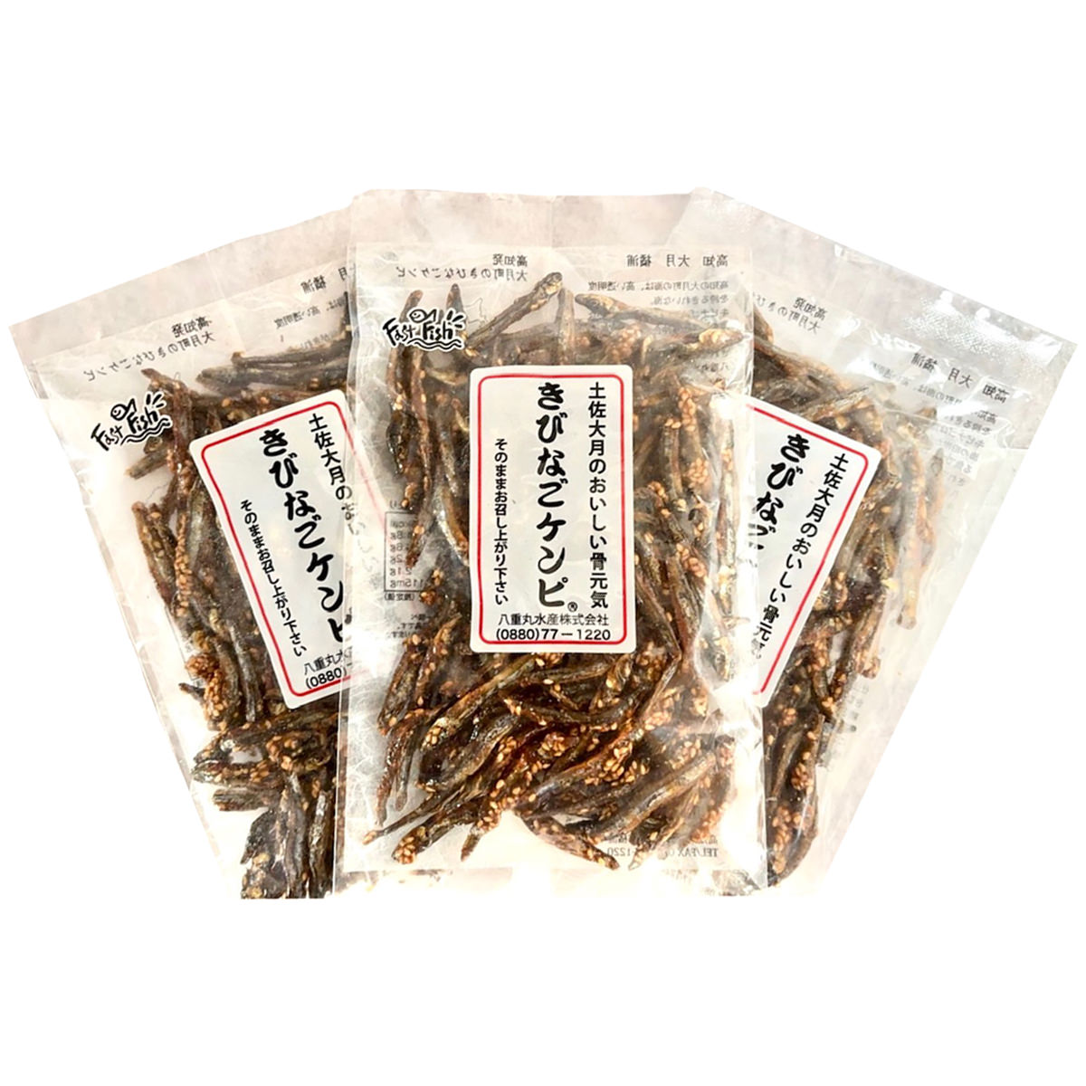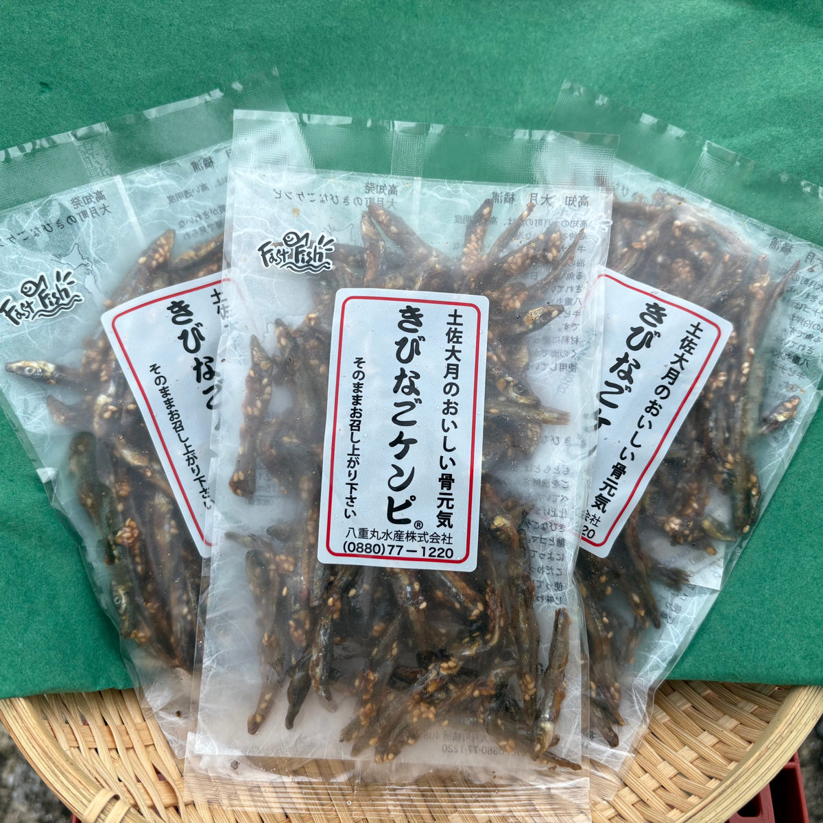 「八重丸水産 国産 きびなごケンピ」は、一度素干しをした国産のキビナゴを一尾一尾丁寧に仕分けをし、素揚げ後に砂糖醤油を絡ませた漁師のおやつです。きびなごのうまみについつい手が止まらない美味しさ。お酒のお供やおつまみにもおすすめです。第6回高知県地場産業大賞にて「奨励賞」を受賞しました(平成23年)。
