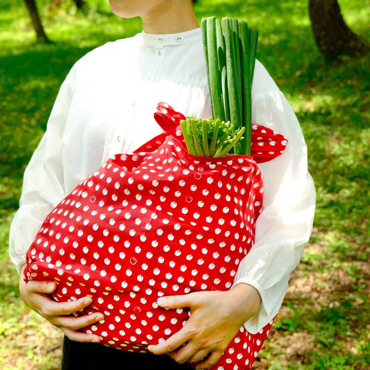 大容量で強度の高い「久光社 りんごのリズム エコバッグ」です。使用しないときは折りたたんでコンパクトに持ち運べます。たたみやすさにもこだわっており、簡単にたためてストレスフリーです。普段のお買い物での使用にぴったりです。旅行時のサブバッグなどとしてもご活用ください。カラーは赤、紺の2色からお選びいただけます。
