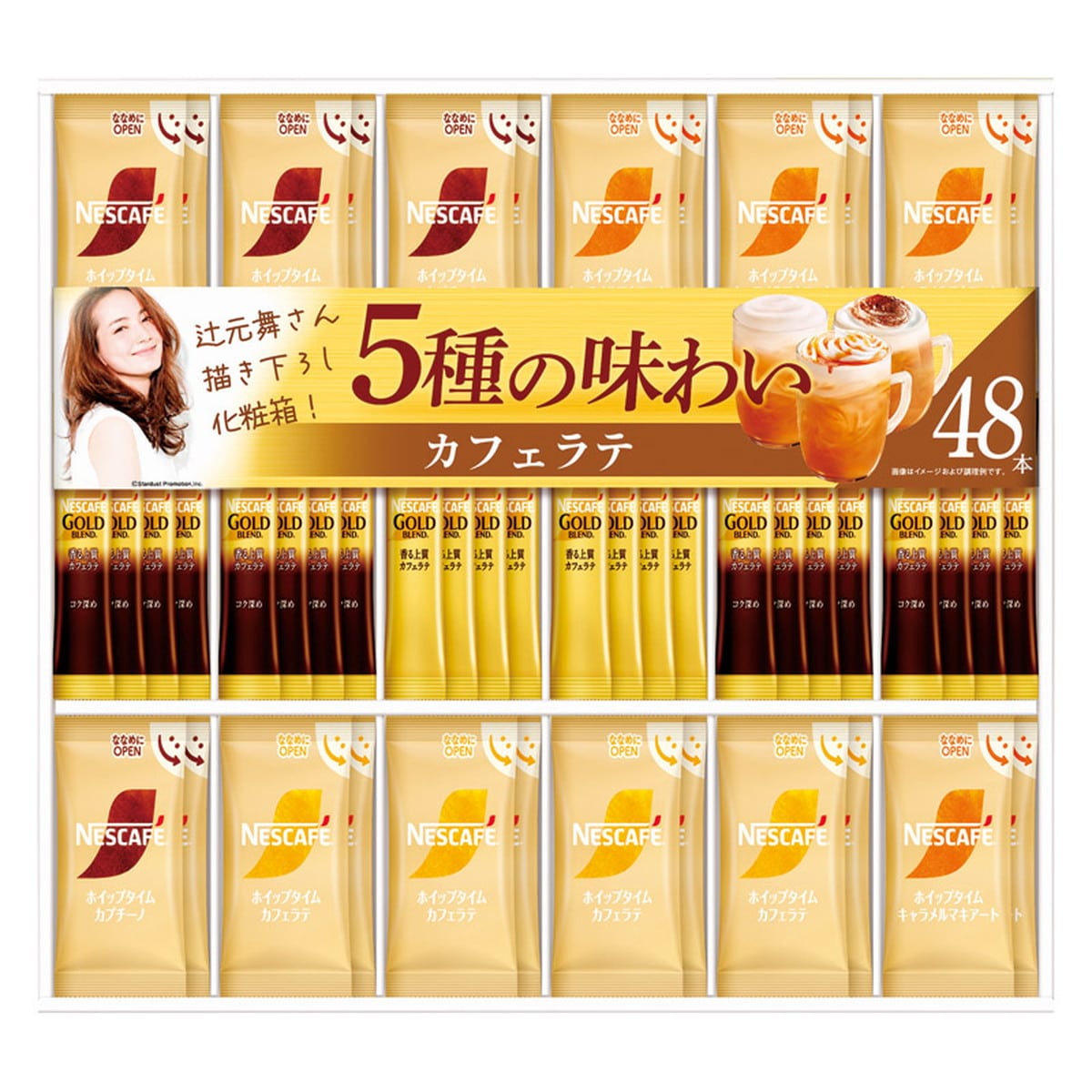 ●数量・内容:ホイップタイムカフェラテ(9.4g)・ホイップタイムキャラメル(11.5g)・ホイップタイムカプチーノ(8.6g)・ゴールドブレンドスティックコーヒー(7g)×各8、ゴールドブレンドコク深め(7g)×16