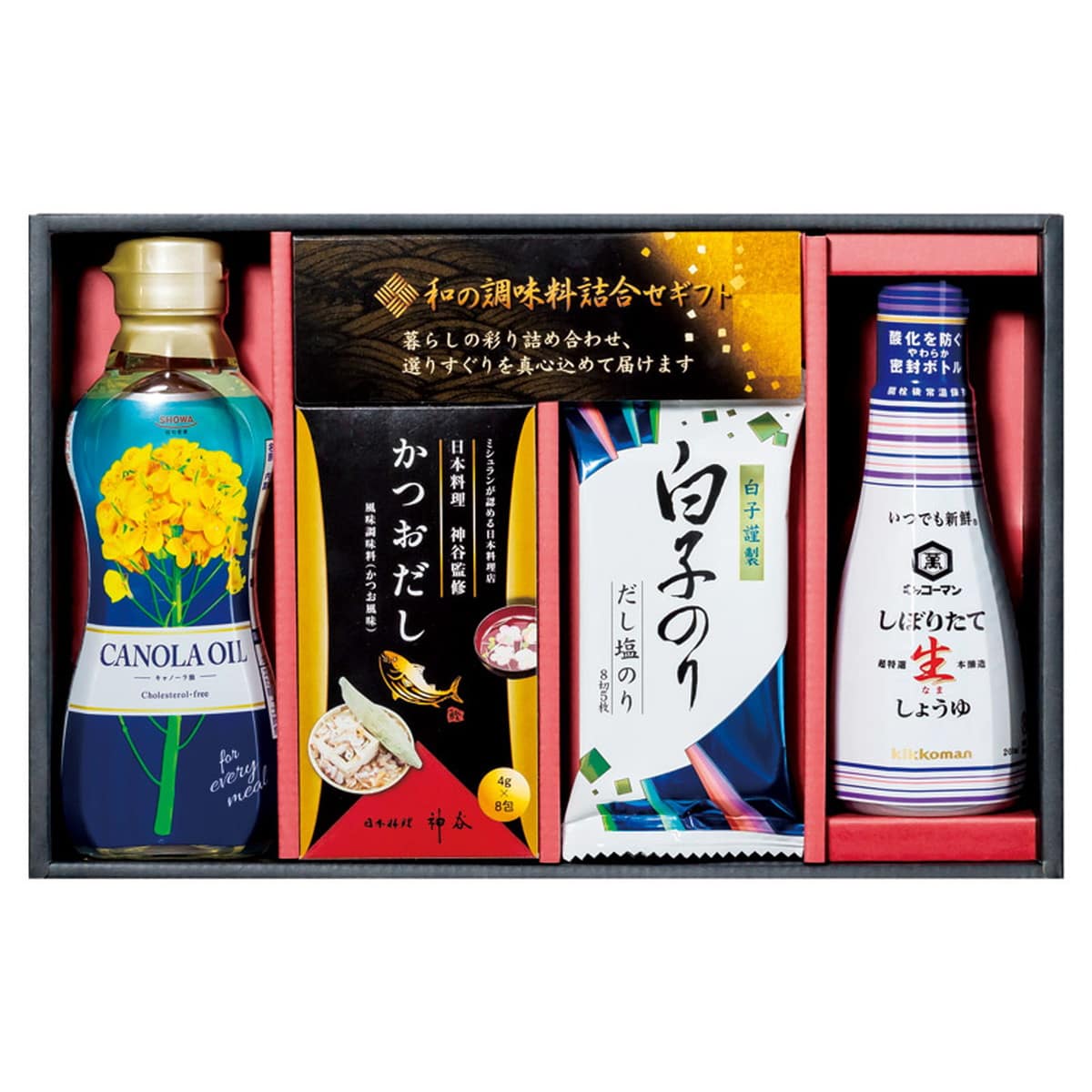 ●数量・内容:キッコーマンしぼりたて生醤油(200ml)・かつおだし(4g×8袋)・白子だし塩のり(8切5枚)・昭和キャノーラ油(300g)×各1