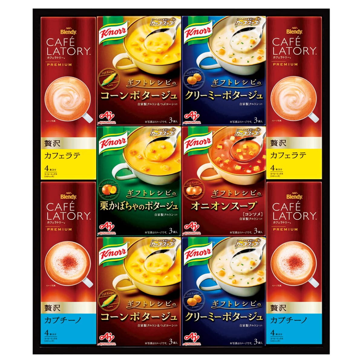 「味の素 〈ギフトレシピ〉「クノール」スープ&コーヒーセット」 朝食や間食などさまざまなシーンで、お子様から大人まで幅広く楽しんでいただける〈ギフトレシピ〉の「クノール カップスープ」と「ブレンディカフェラトリー」スティック プレミアムのギフトです。