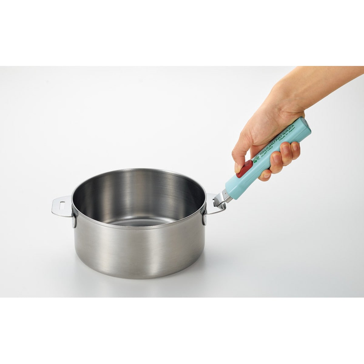 「燕熟の技 ハンドル着脱式鍋14cm&16cmセット」 熟練の技巧、信頼の日本製。優れた耐久性と保温性を誇るステンレス鋼。ハンドルは着脱式なので、コンパクトに収納できます。ハンドルとツマミは可愛らしいパステルカラーで、ハンドルには幸運を表す四つ葉のクローバーのロゴ入りです。本体のみ食洗機OK。