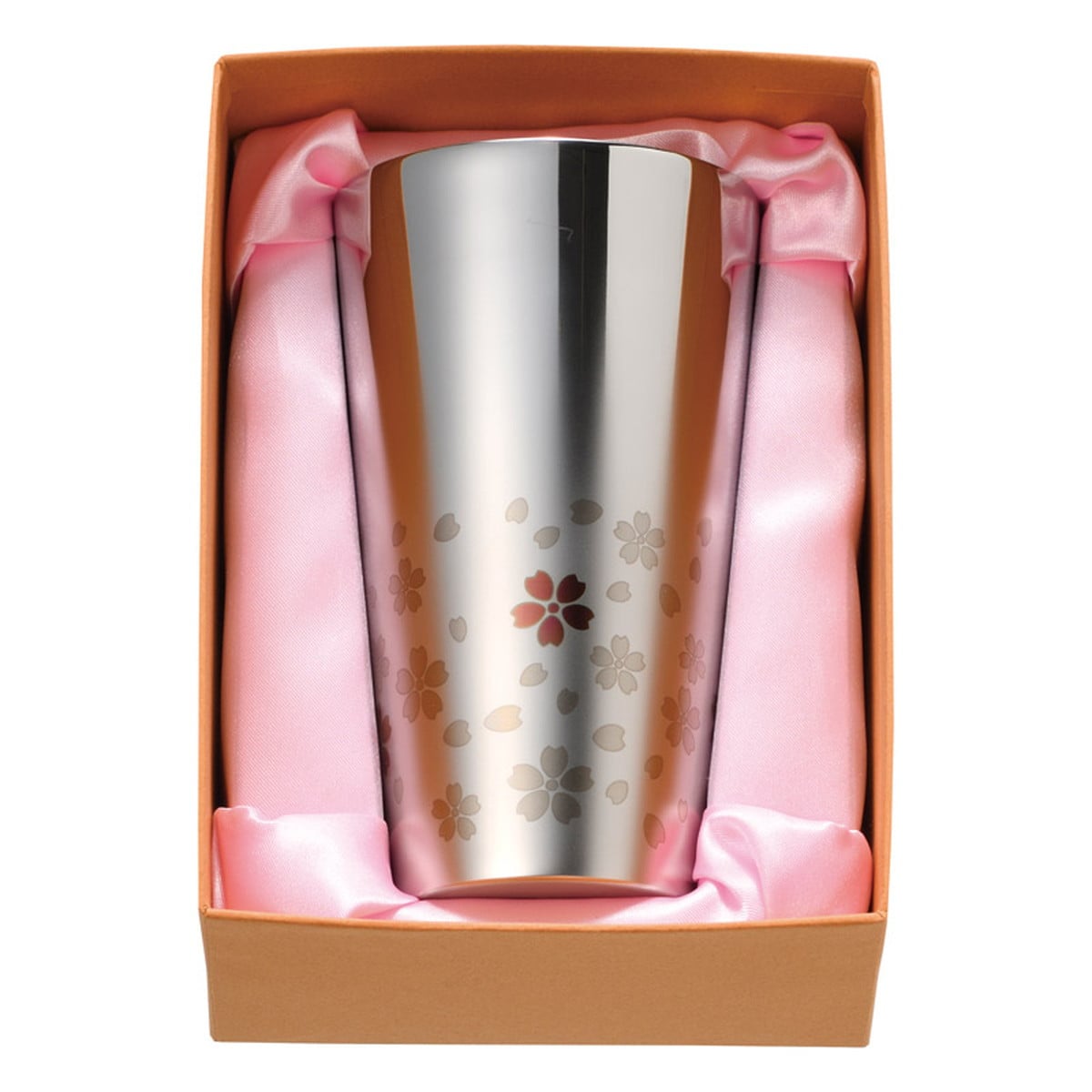 「さくら街道 ステンレス二重タンブラー(内面金メッキ) 300ml」 艶やかな越後の花絵巻をイメージした優美な桜柄のステンレス二重タンブラー。美しい鏡面磨き。飲み物本来の味を楽しめる内面金メッキ仕上げ。