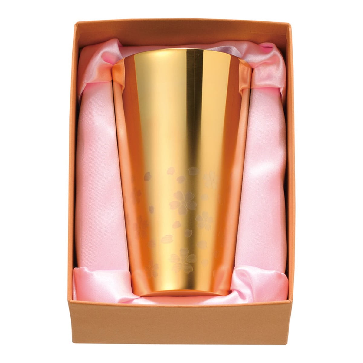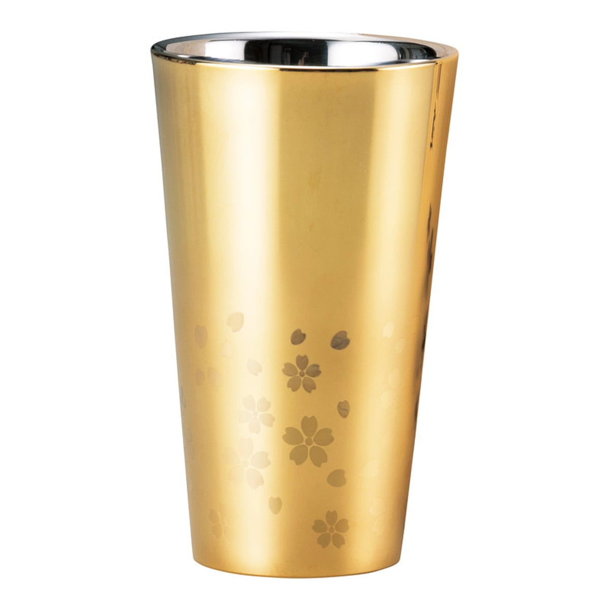 「さくら街道 ステンレス二重タンブラー(外面金メッキ) 300ml」 艶やかな越後の花絵巻をイメージした優美な桜柄のステンレス二重タンブラー。見た目が豪華で鮮やかな外面金メッキ仕上げ。