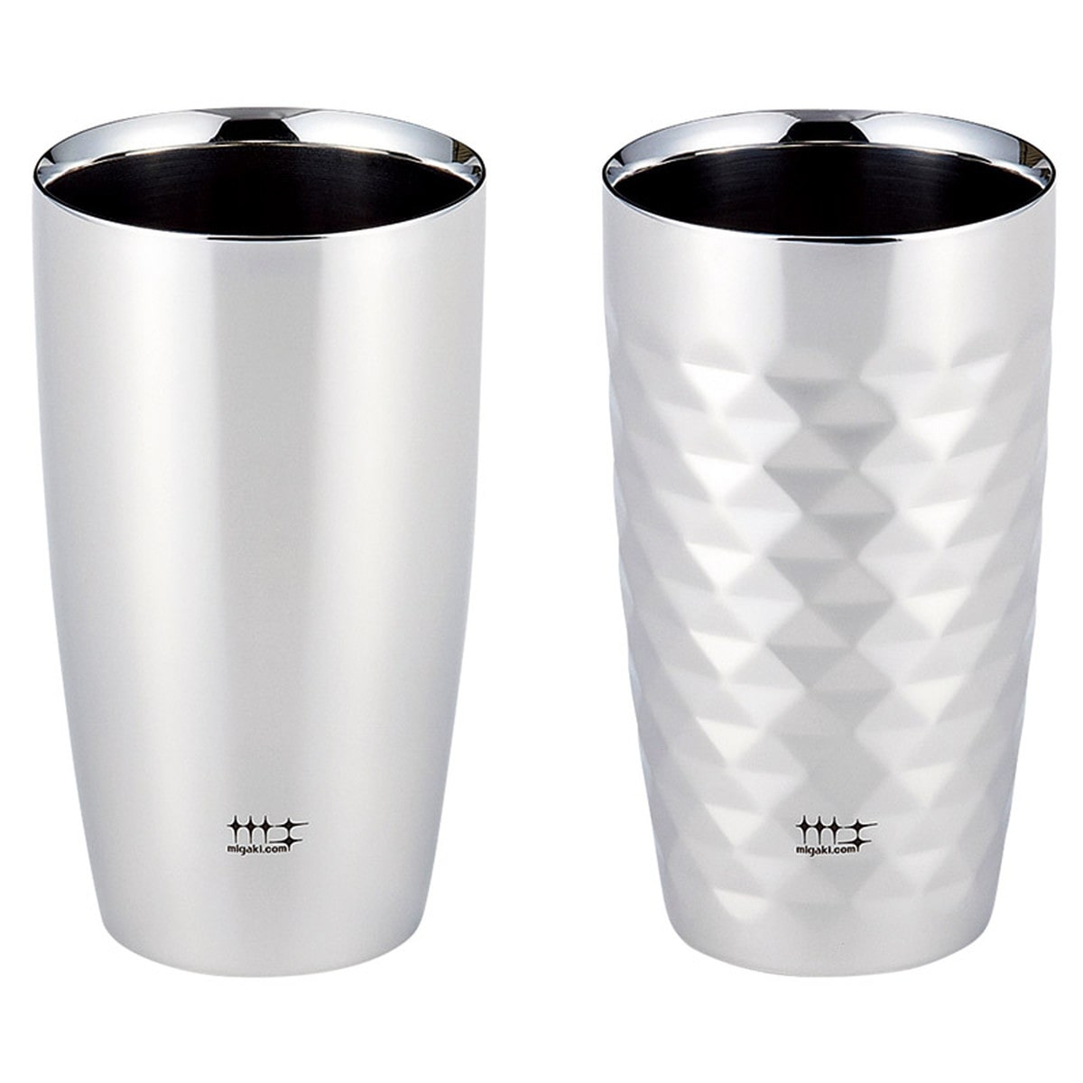 「磨き屋シンジケート 二重タンブラー2P」 二重構造なので保冷・保温に優れています。ウイスキーや焼酎のロック、お湯割り等でもお楽しみいただけます。シンプルなタイプとダイヤモンドカットの二重構造タンブラーセット。