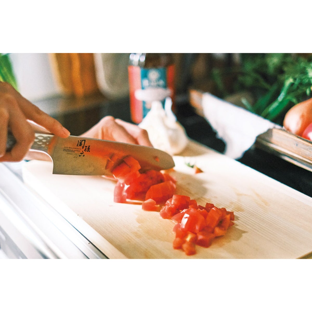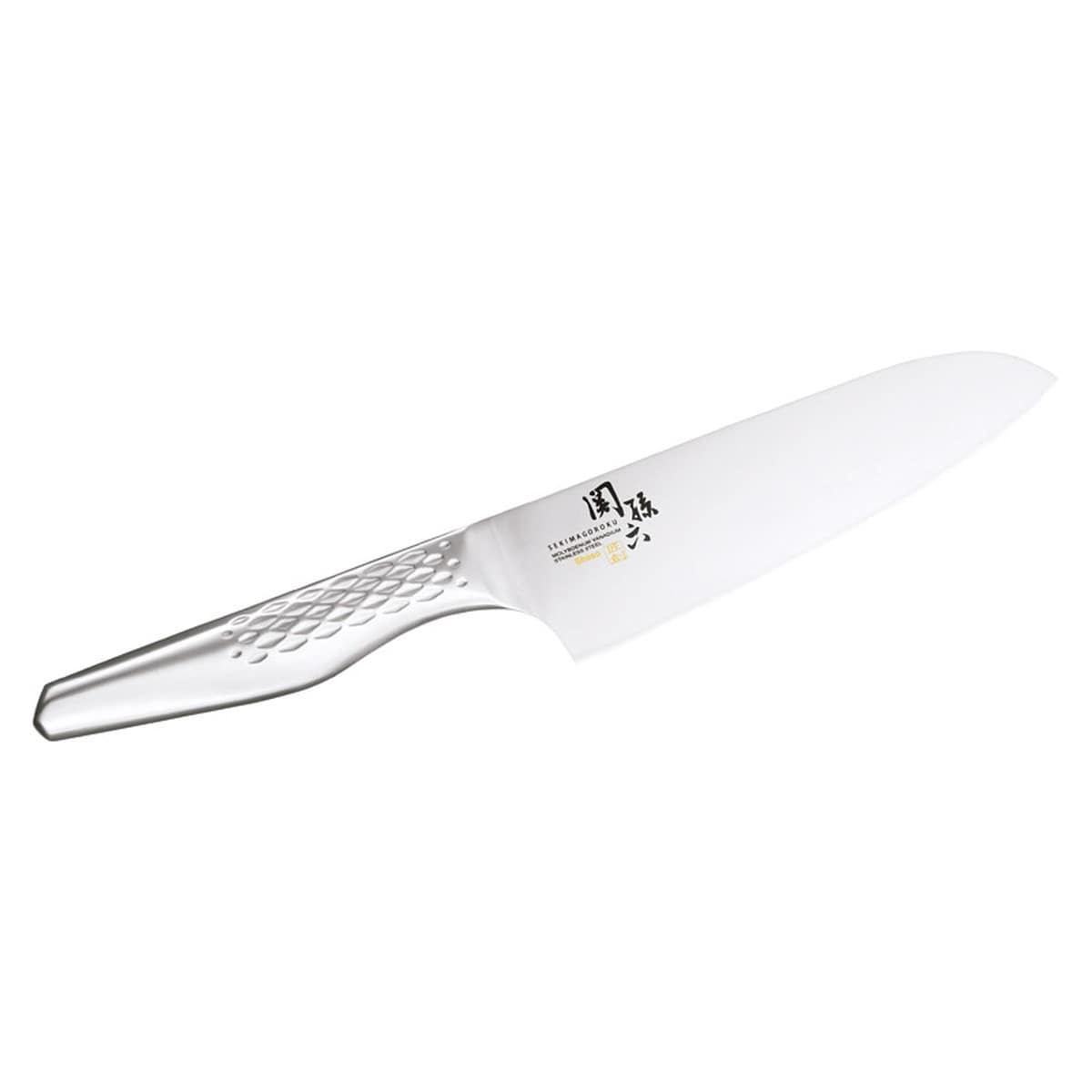 「関孫六 匠創 三徳包丁」 継ぎ目のない、一体構造のオールステンレスタイプ。指がかりがよくグリップ感の高い流線型のハンドルデザインです。