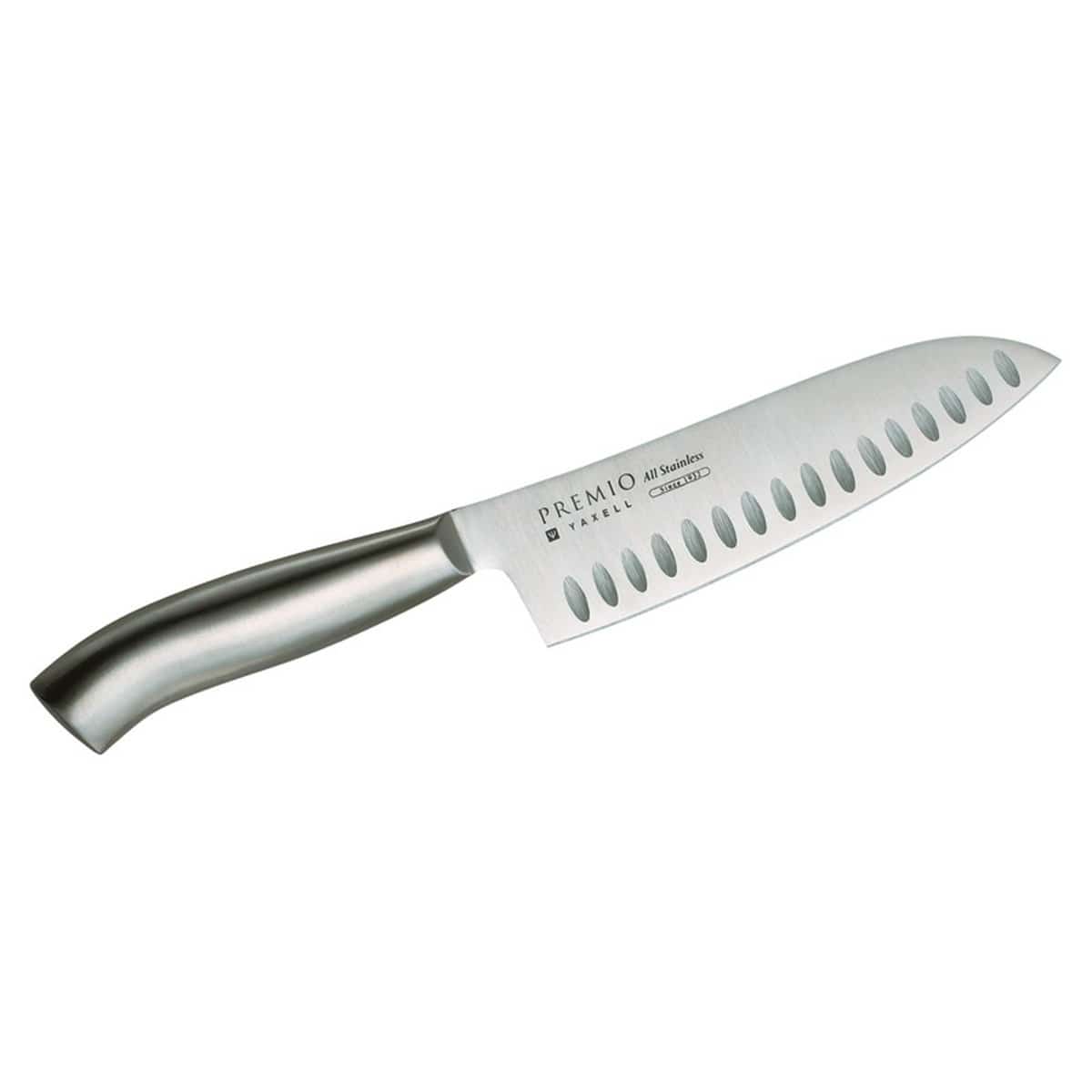 「プレミオ オールステンレス三徳包丁」 オールステンレスなので洗い易くて衛生的。軽くて使いやすい機能的な包丁。刃先のディンプル加工は食材の切り離れをよくします。