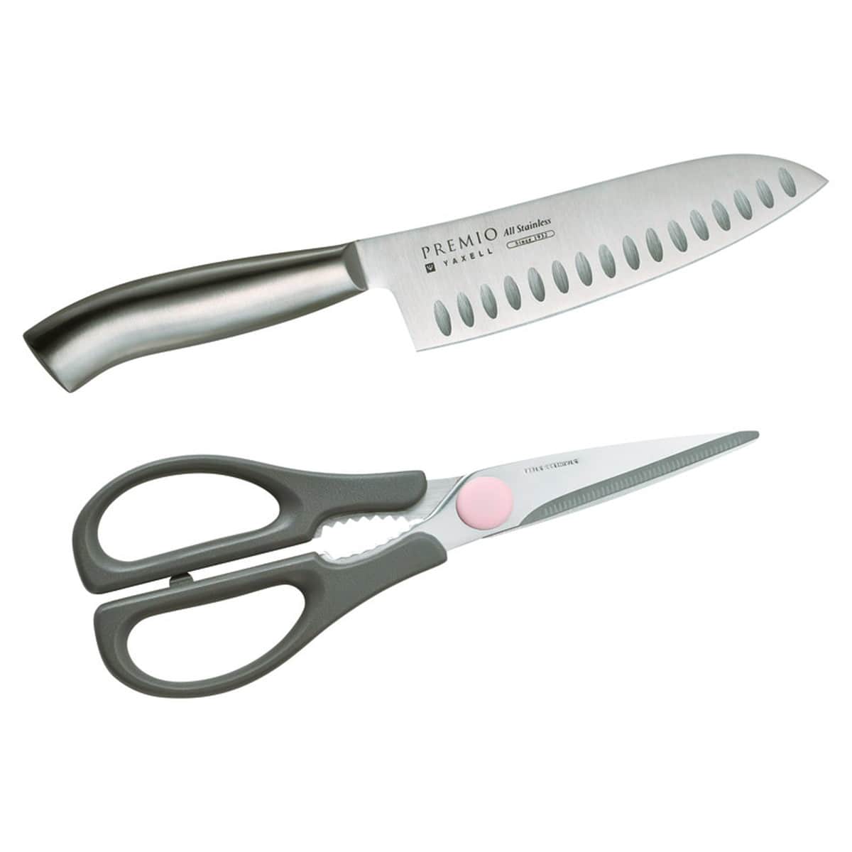 「プレミオ オールステンレス三徳・キッチンバサミセット」 お手入れ簡単、継ぎ目のないオールステンレス製の万能包丁と、便利なキッチンバサミをセットにしました。