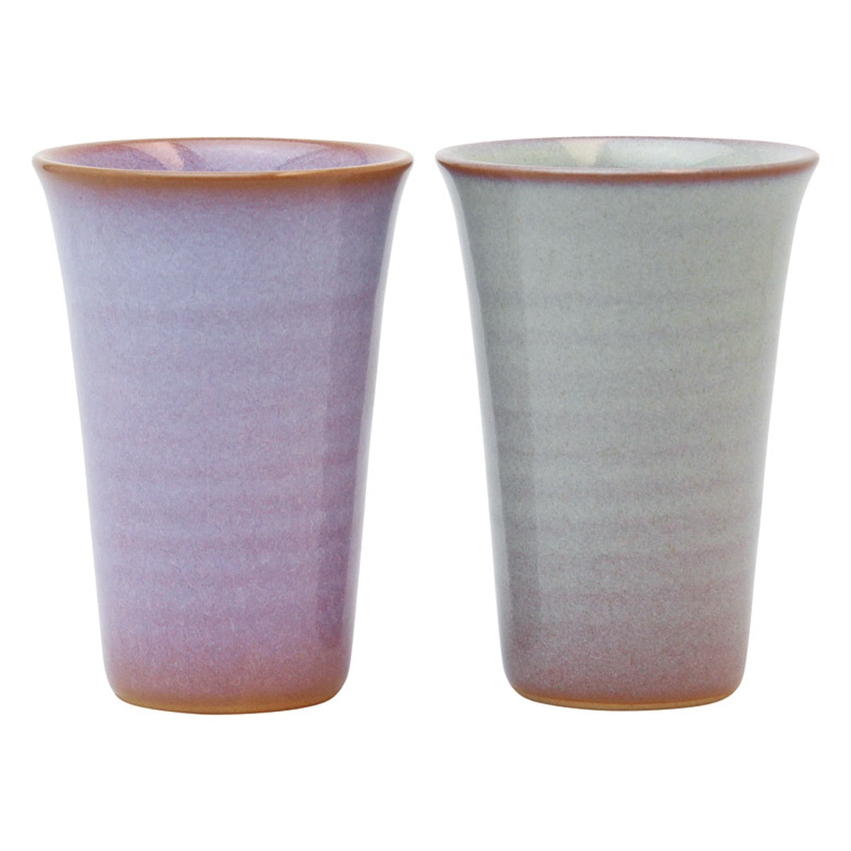 「萩焼 二色フリーカップ」 土と釉薬の組み合わせで発色する萩むらさきと緑かかったグレーの落ち着いた色合いの色違いのカップペアセットです。