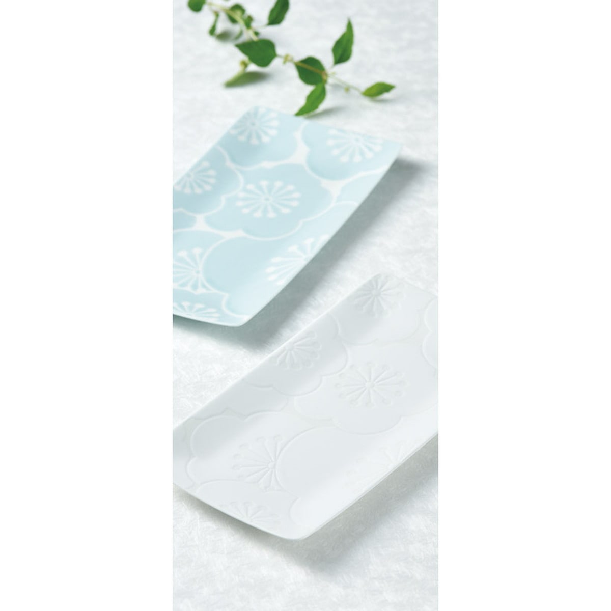 「はふり 長角皿ペア(青・白)」 透明感のある清楚な色釉により描かれた模様が美しく、また模様の釉薬部分が浮き上がっているのも特徴的。上品で優雅な雰囲気です。薄くて軽く、キレイなラインも魅力です。「はふり」とは「祝」の特殊な読み方で悪運をはらう言葉と運気を呼び込む縁起の良い柄で気持ちも晴れやかにしてくれそうです。