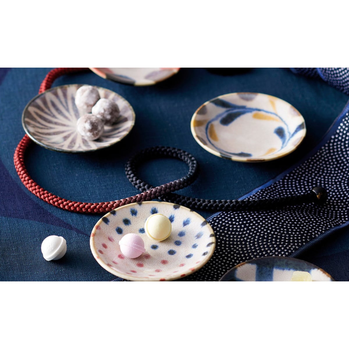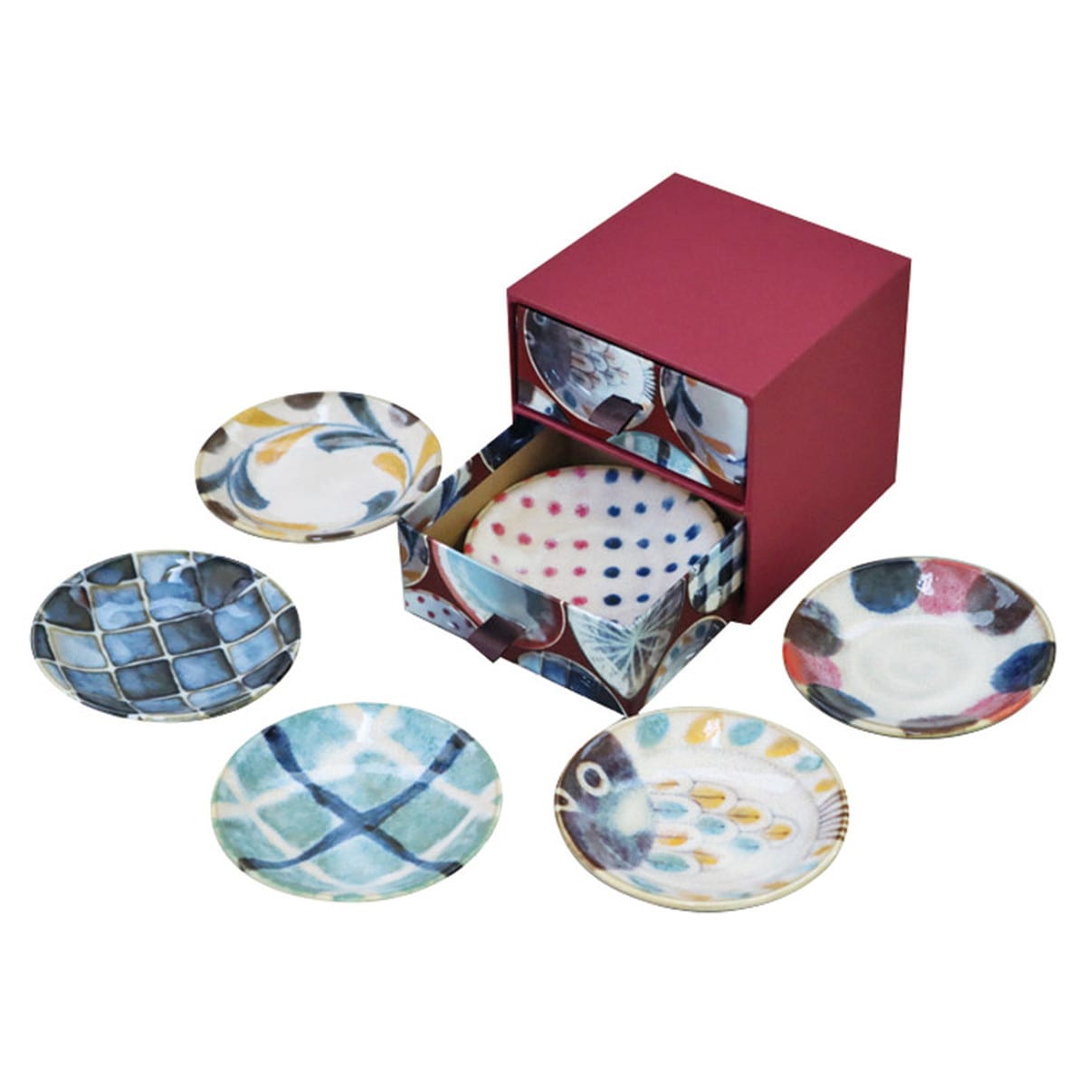 「Brush Blue ブラッシュカラー 六種小皿揃(タンス箱入)」 厳選された六柄は、手描きのような味わいが楽しめます。プレゼントやギフトにもピッタリの小皿セットです。箱は小物入れとしてもお使いいただけます。