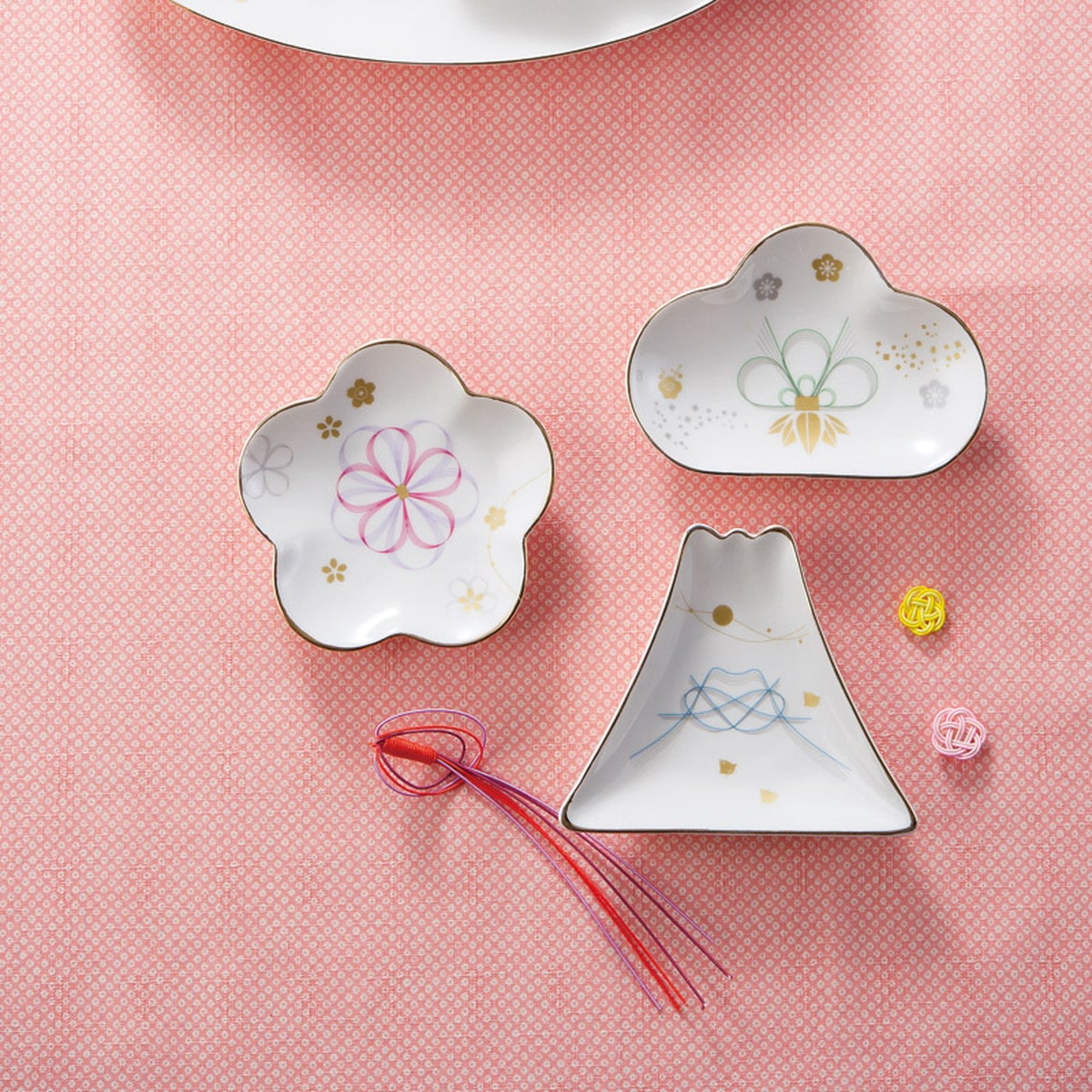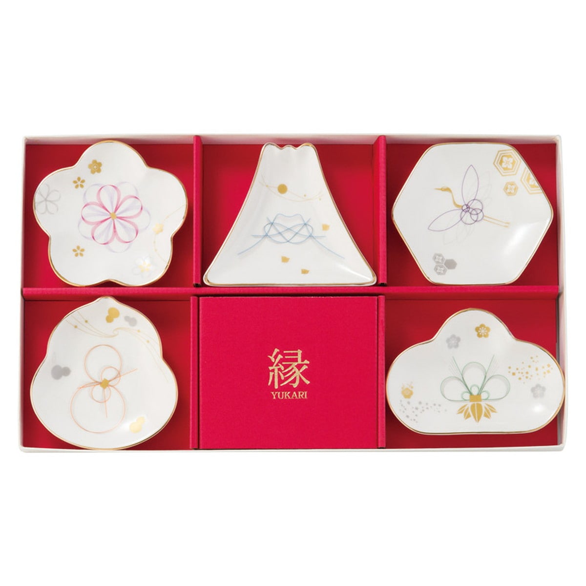 「縁-yukari- 五様小皿揃」 水引をイメージした上品な和のデザイン。結婚式の引出物や嬉しいお祝いに喜ばれます。