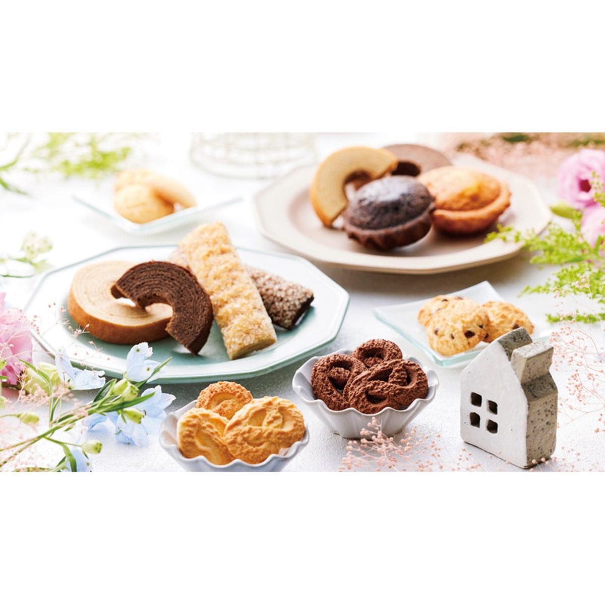 ●数量・内容:クッキー(ミルク・メープル・ショコラ・チョコチップ)・マドレーヌ(プレーン・チョコ)×各2、スティックパイ(メープル・ショコラ)×各4、バウムクーヘン(バニラ・ココア)×各3