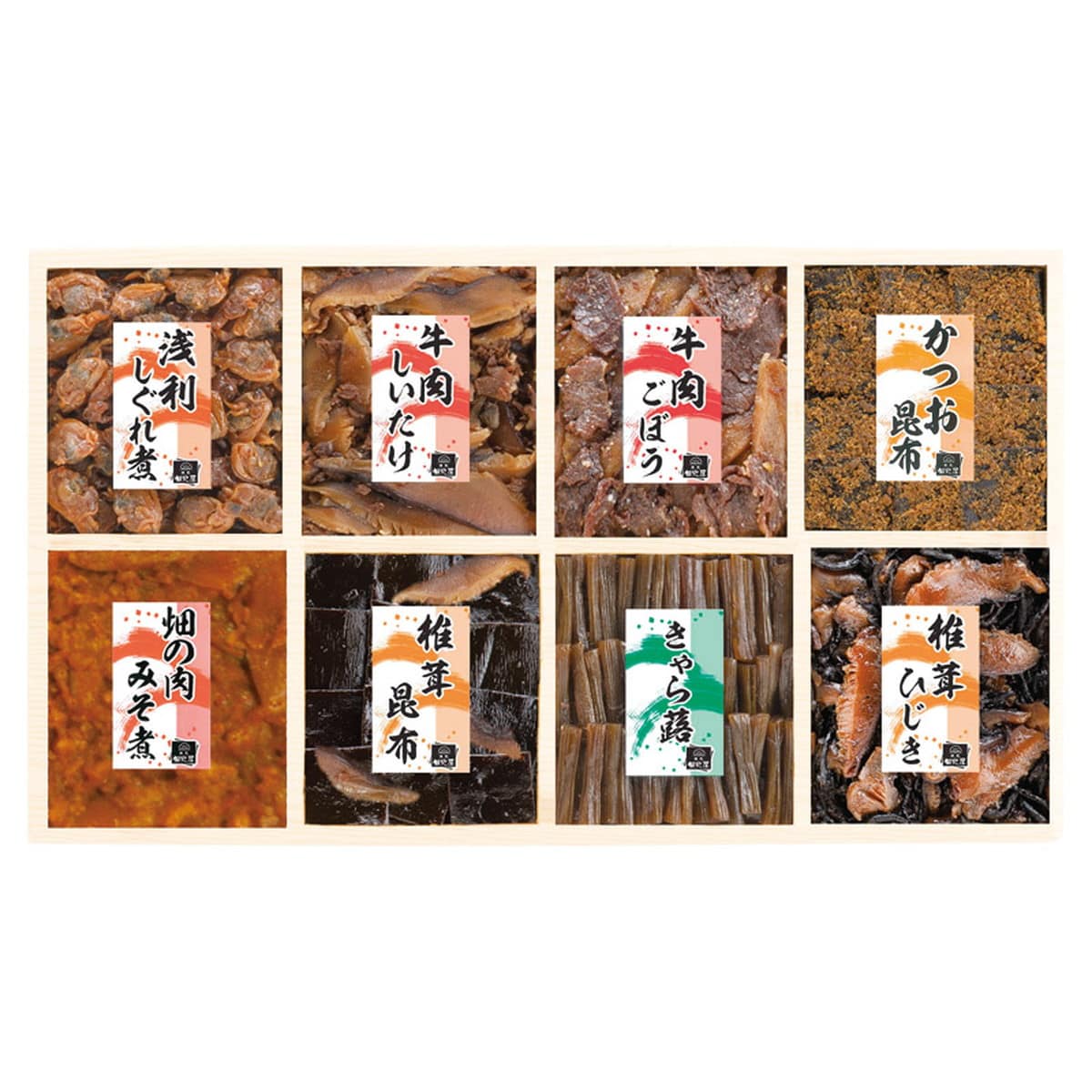 ●数量・内容:浅利しぐれ煮(50g)・牛肉しいたけ(50g)・牛肉ごぼう(50g)・かつお昆布(60g)・畑の肉みそ煮(50g)・椎茸昆布(60g)・きゃら蕗(60g)・椎茸ひじき(50g)×各1