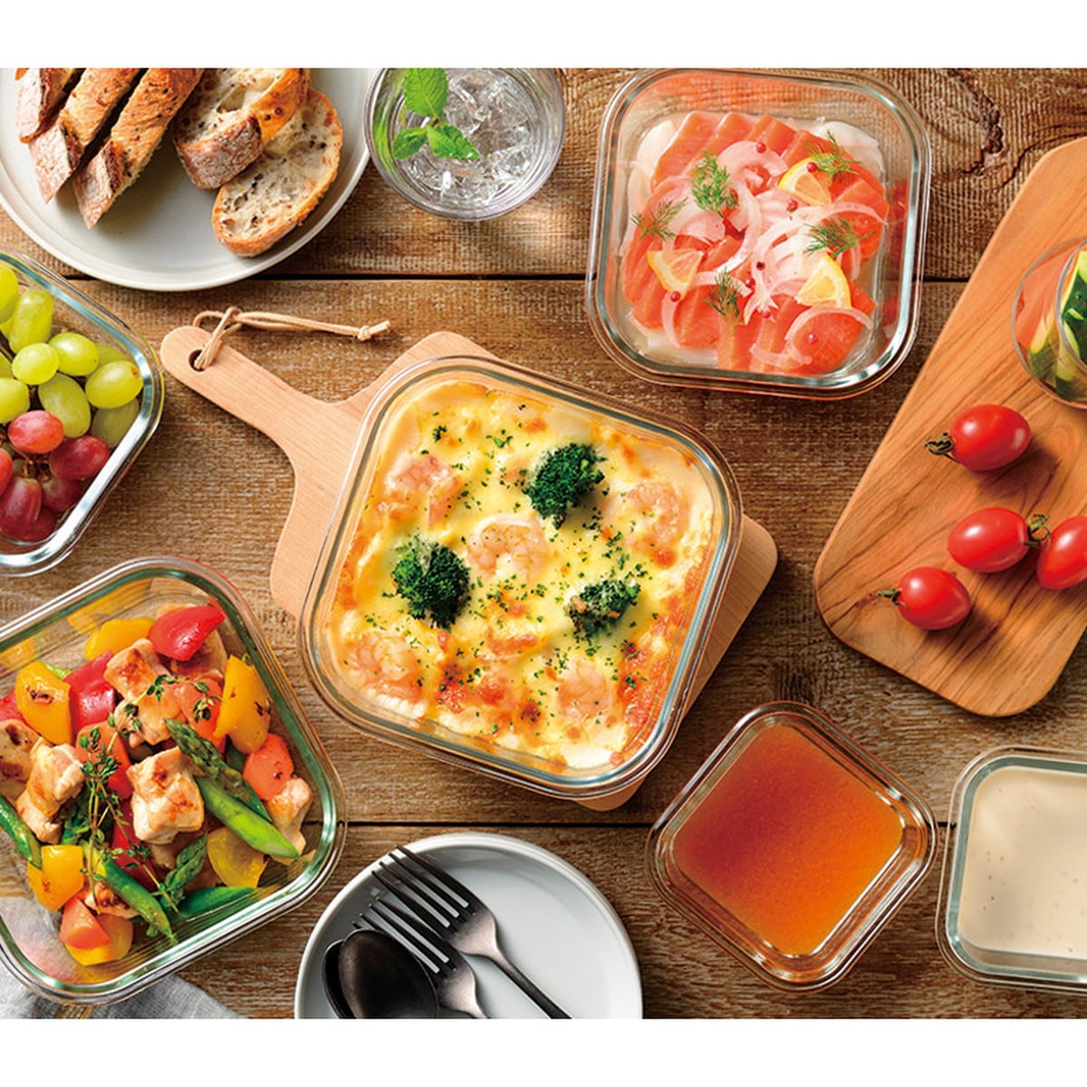 「レッシュ 耐熱ガラス容器3点セット ME-7396」 本体は耐熱温度差120度の耐熱ガラスなので電子レンジはもちろん、オーブン調理も可能。ニオイもつきにくいです。蓋はシリコーンパッキン&4点ロックでしっかり保存することができます。ガラスで透明なので冷蔵庫の中を見たときに一目で中身を確認できます。食洗機OK。