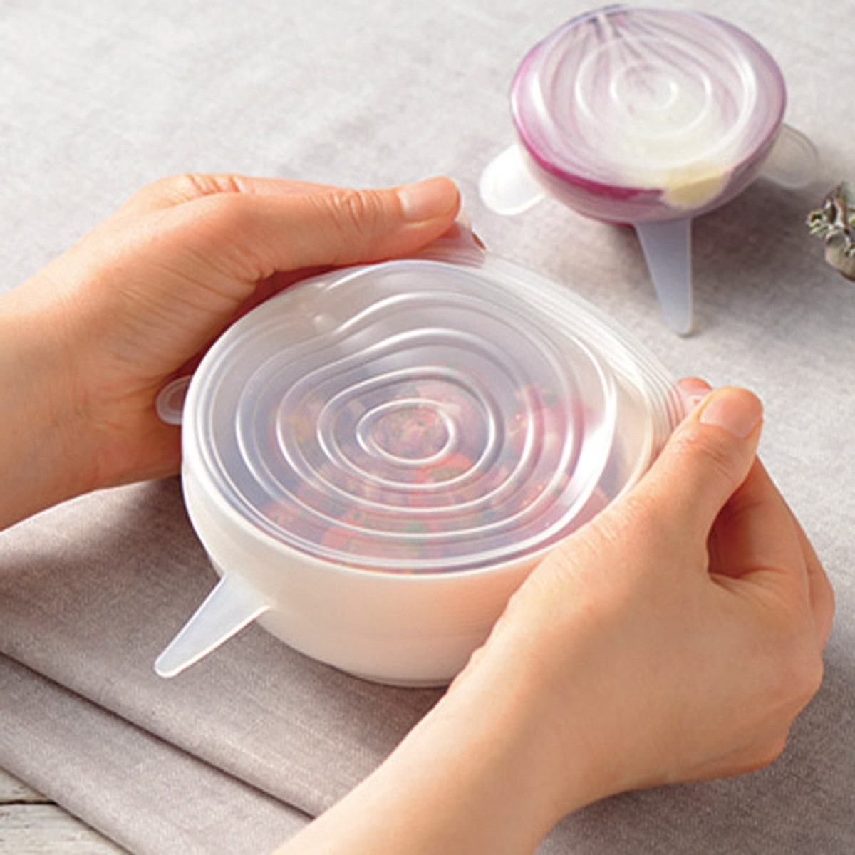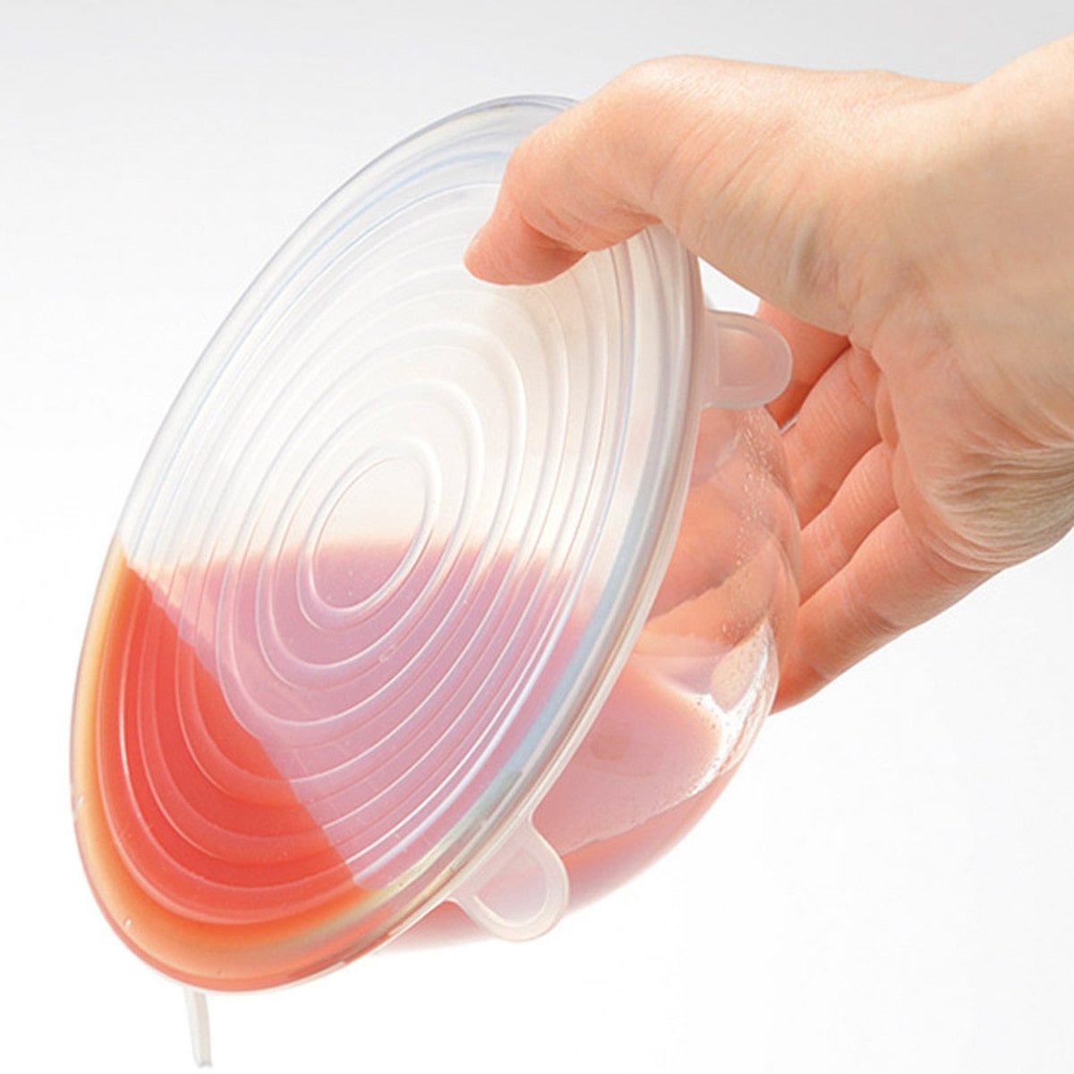「ラクーニ 丸形シリコーンラップM(3枚入) RE-7359」 伸びてピタッと保存できる抗菌剤入りのラップです。ピッタリ容器にフィットするので汁物が漏れにくいです。着脱しやすいつまみも付いています。洗って繰り返し使えるので環境にも優しい商品です。