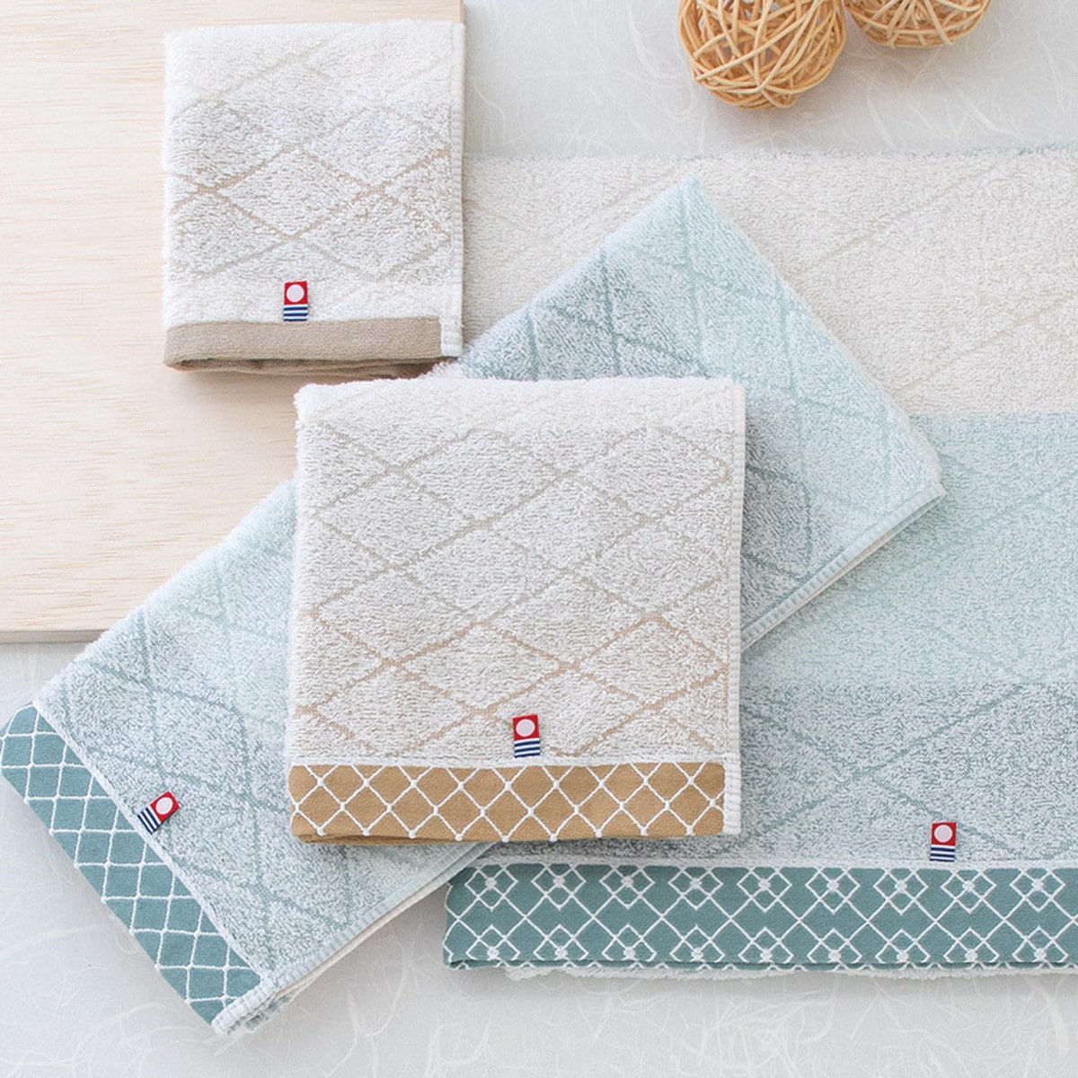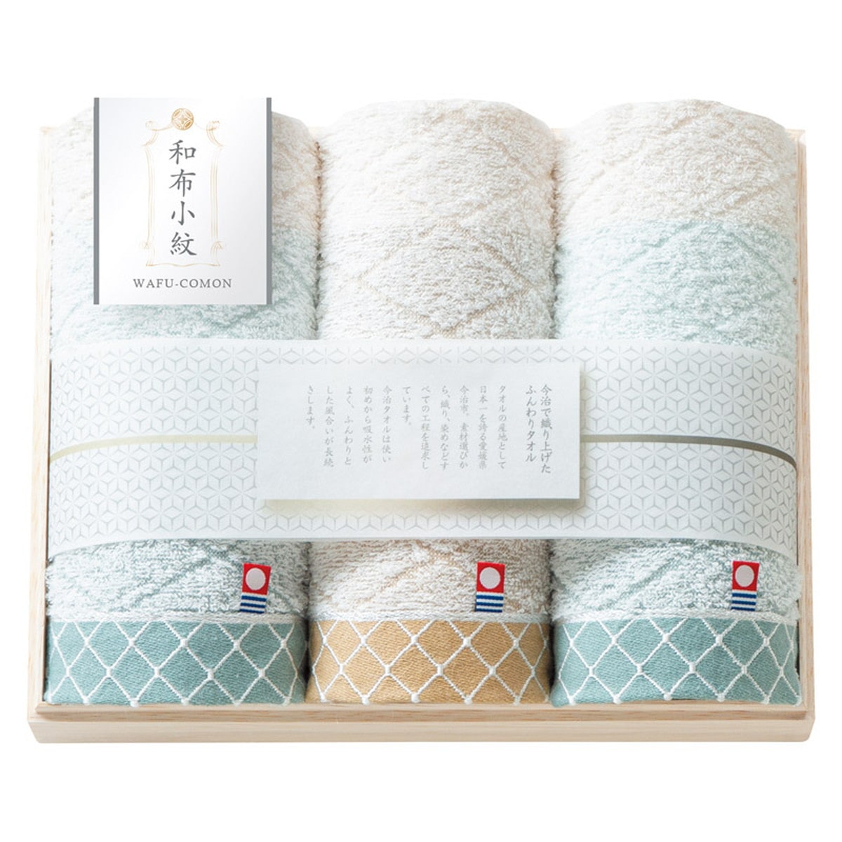 「和布小紋[modern] フェイスタオル3P(国産木箱入) KWFK-030K」 日本一のタオル産地・今治で丁寧に織り上げられた高品質タオルを、格調高い木箱に入れて贈ります。日本伝統の小紋柄をあしらったタオルは、和の美しさをシンプルに伝えます。どんな場にも馴染むので、使いやすいタオルです。