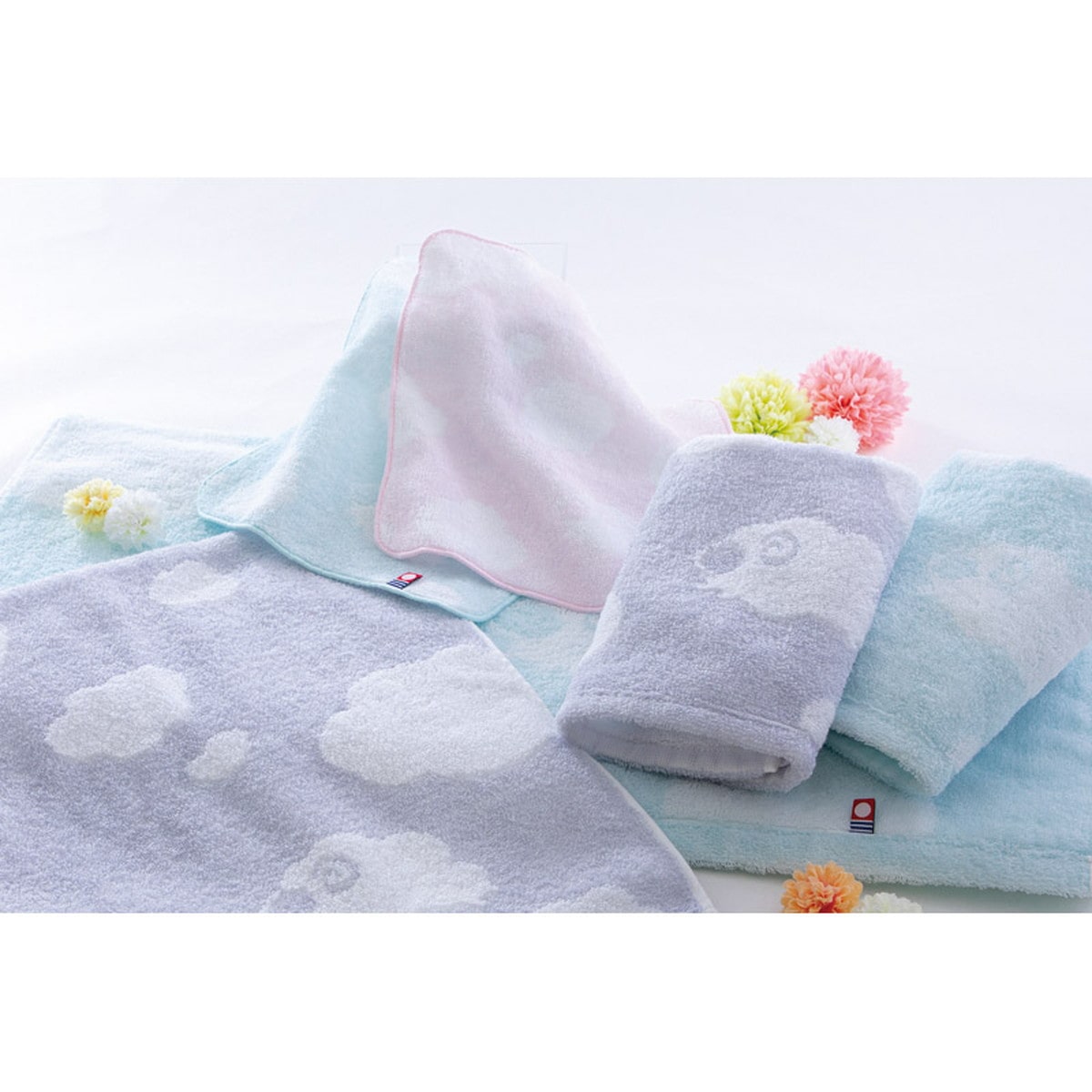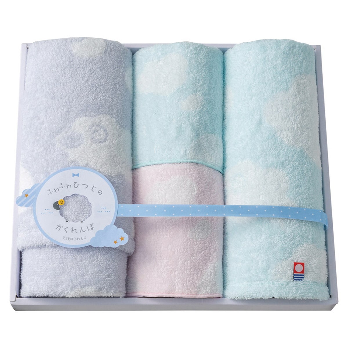 「天使のふわもこ ふわふわひつじのかくれんぼ タオルセット FH-525」 まるで雲のような、ふんわりとした柔らかさが特徴のタオルです。糸の撚りをゆるく「甘撚り」した、通常の糸より柔らかい糸で織り上げています。かわいらしいひつじの柄をあしらい、やさしい色合いに仕上げました。