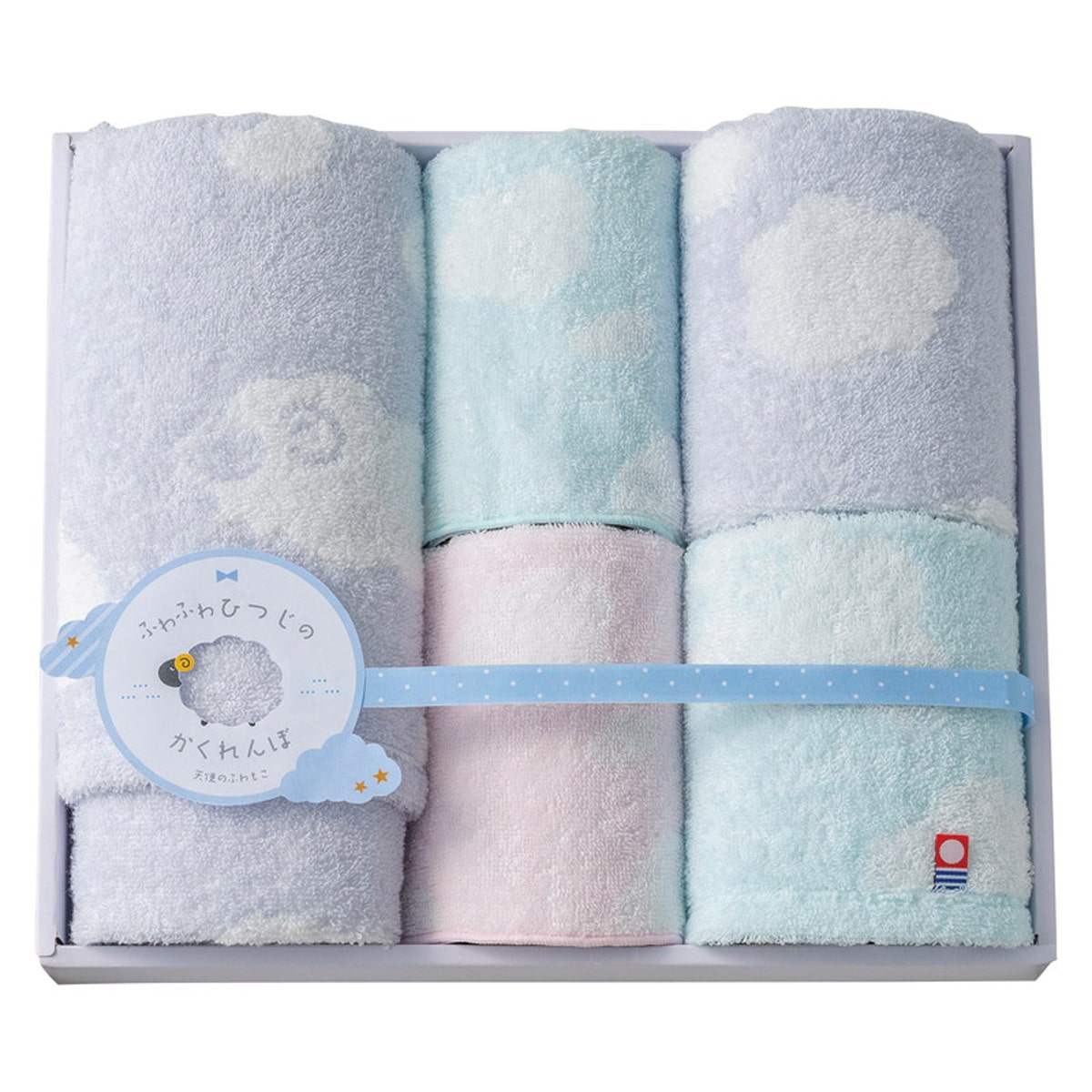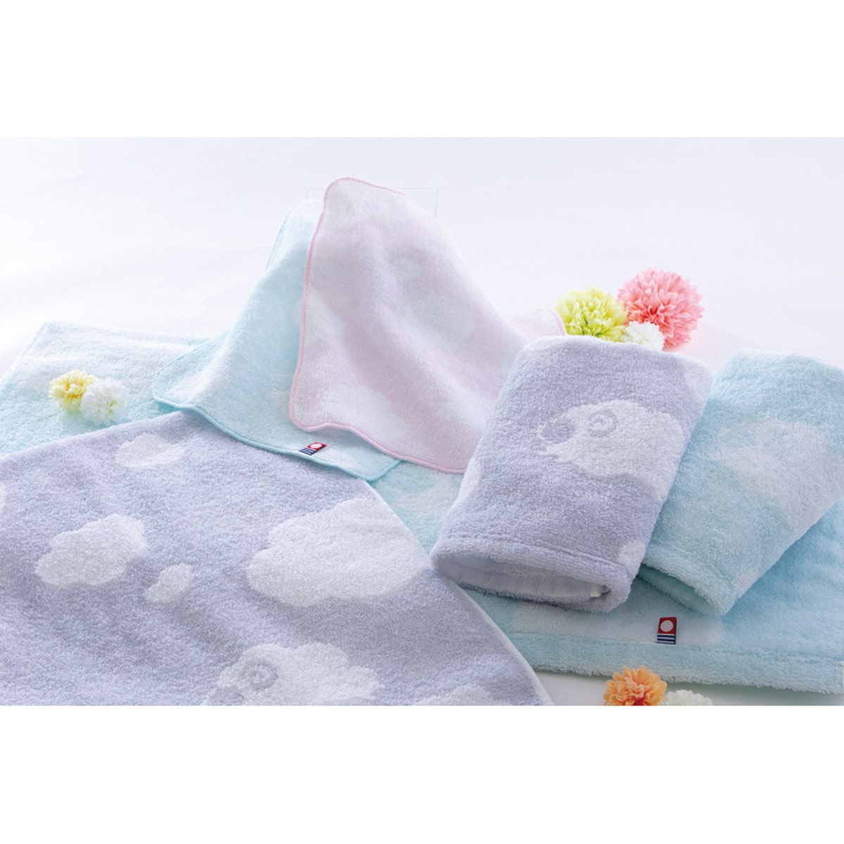 「天使のふわもこ ふわふわひつじのかくれんぼ タオルセット FH-530」 まるで雲のような、ふんわりとした柔らかさが特徴のタオルです。糸の撚りをゆるく「甘撚り」した、通常の糸より柔らかい糸で織り上げています。かわいらしいひつじの柄をあしらい、やさしい色合いに仕上げました。