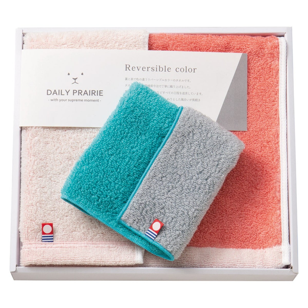 「DAILYPRAIRIE リバーシブル フェイスタオル1P・タオルハンカチ1P COREV-0185」 裏と表で色の違うリバーシブルカラーのタオルです。素材選びから、織り、染めなどすべての工程を追求しています。使い初めから吸水性がよく、ふんわりとした風合いが長続きします。