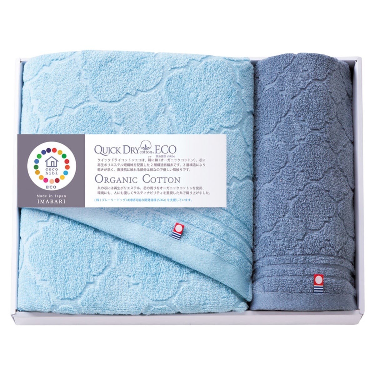 「cocohibi クイックドライコットンエコ バス1P・フェイスタオル1P QD-041」 クイックドライコットンエコは、鞘に綿(オーガニックコットン)、芯に再生ポリエステル短繊維を配置した2層構造紡績糸です。2層構造により乾きが早く、直接肌に触れる部分は綿なのでやさしい肌ざわりです。