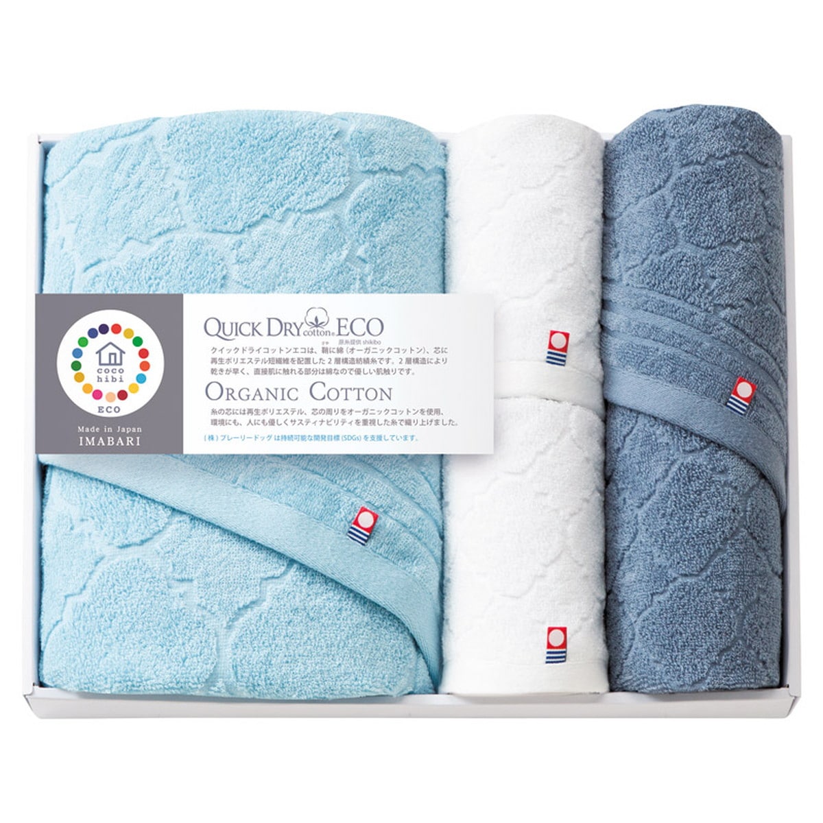 「cocohibi クイックドライコットンエコ タオルセット QD-051」 クイックドライコットンエコは、鞘に綿(オーガニックコットン)、芯に再生ポリエステル短繊維を配置した2層構造紡績糸です。2層構造により乾きが早く、直接肌に触れる部分は綿なのでやさしい肌ざわりです。