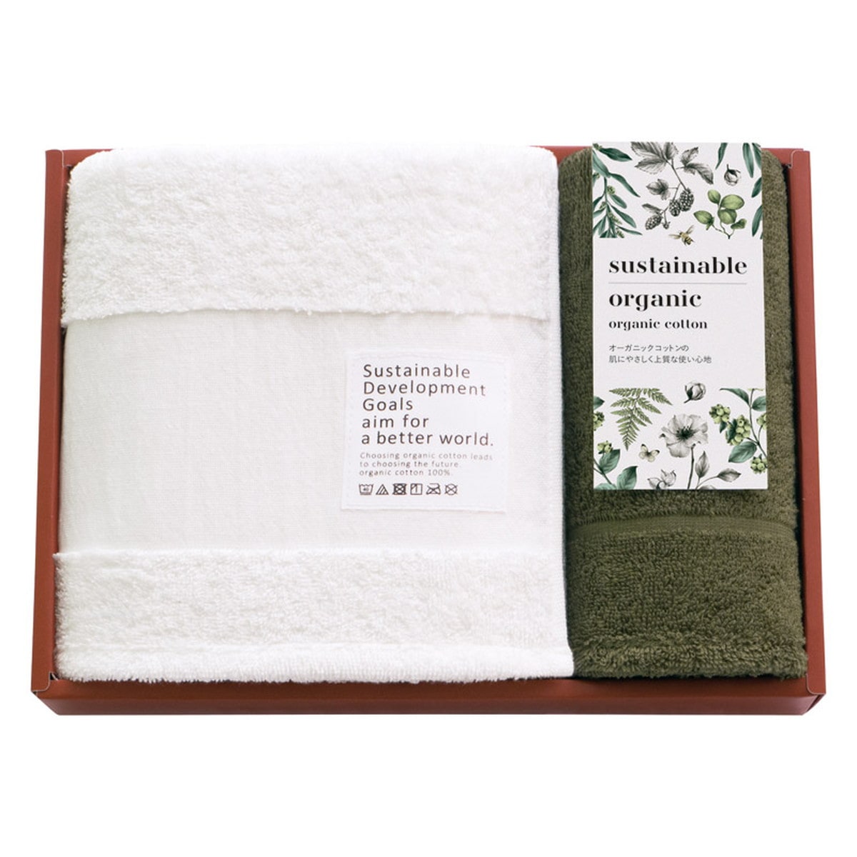 「国際認証取得オーガニック バス1P・フェイスタオル1P グリーン 64742」 国際認証取得オーガニックコットン100%の肌にやさしく上質な使い心地。ソフトな中厚手タイプで吸水力が良いタオルです。国際的な認証を多数取得している海外の工場で生産しており、工場で出たエネルギーは循環させて再利用にも取組んでいます。