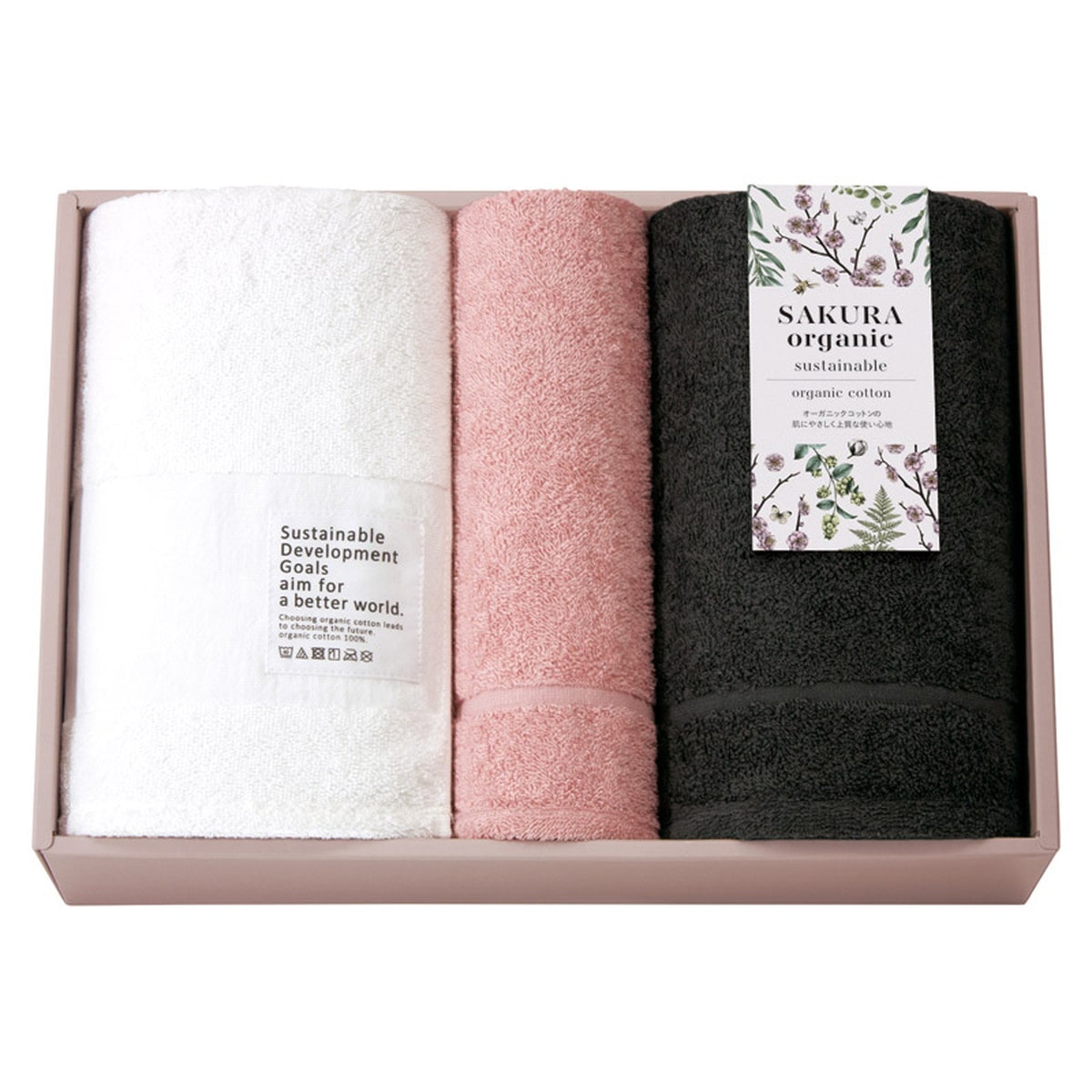 「国際認証取得オーガニック バス2P・フェイスタオル1P サクラ 67072」 国際認証取得オーガニックコットン100%の肌にやさしく上質な使い心地。ソフトな中厚手タイプで吸水力が良いタオルです。国際的な認証を多数取得している海外の工場で生産しており、工場で出たエネルギーは循環させて再利用にも取組んでいます。