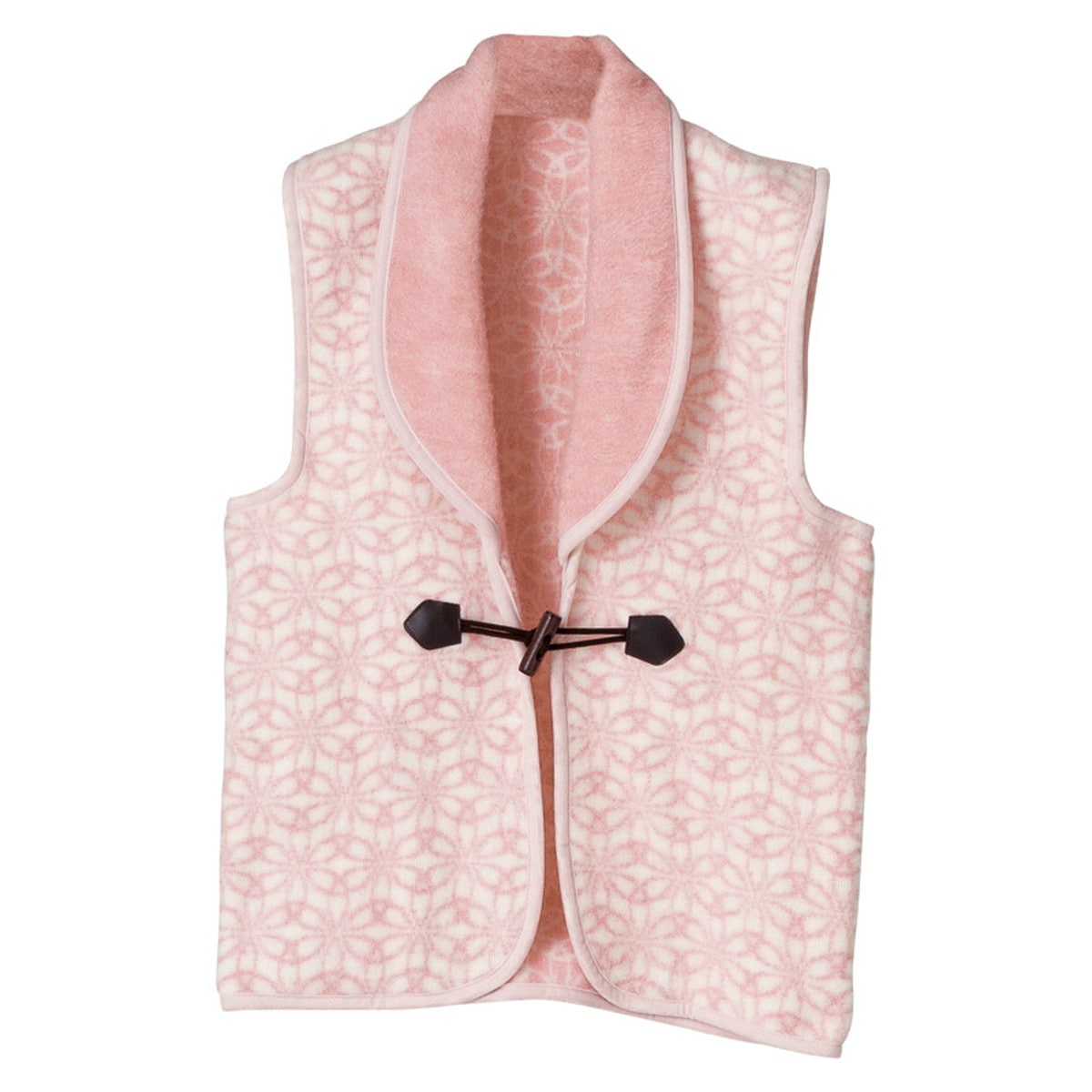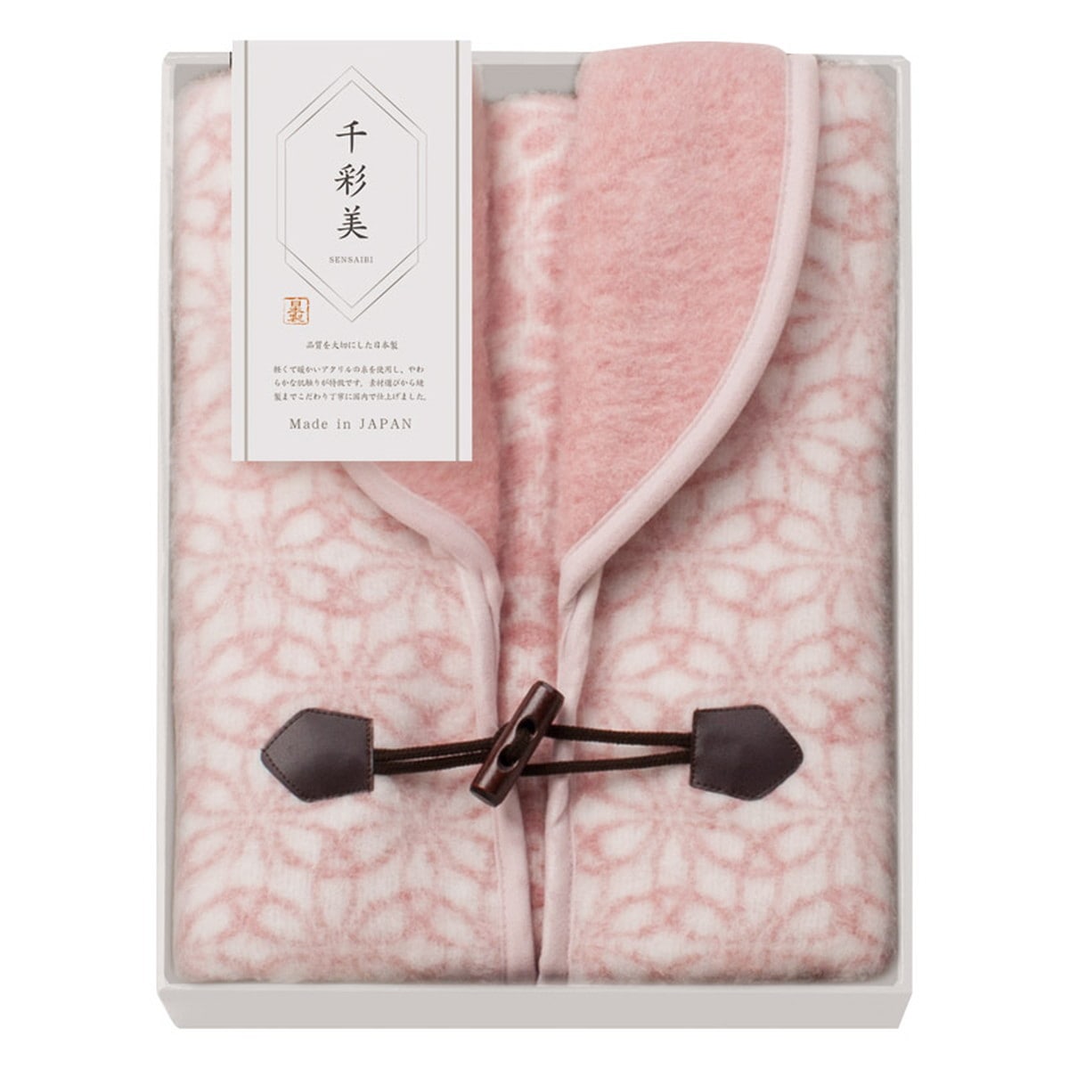 「千彩美 七宝 ホームベスト ピンク KHL-550 PI」 軽くて暖かいアクリルの糸を使用したやわらかな肌ざわりが特徴です。素材選びから縫製までこだわり国内で丁寧に仕上げました。(ポリッシャー加工)繊維を熱処理で直毛にすることで、やわらかさとツヤを与える後加工を施しています。