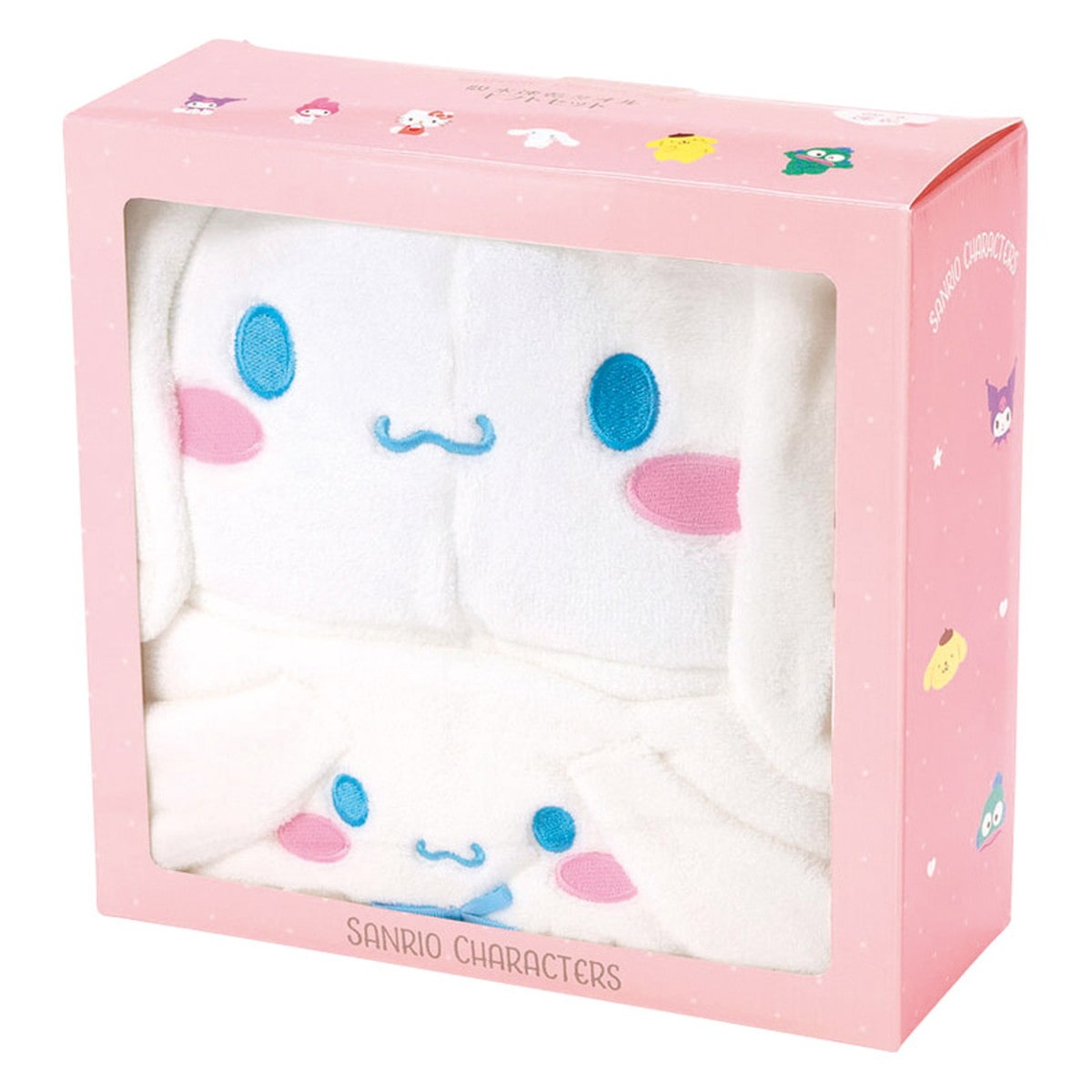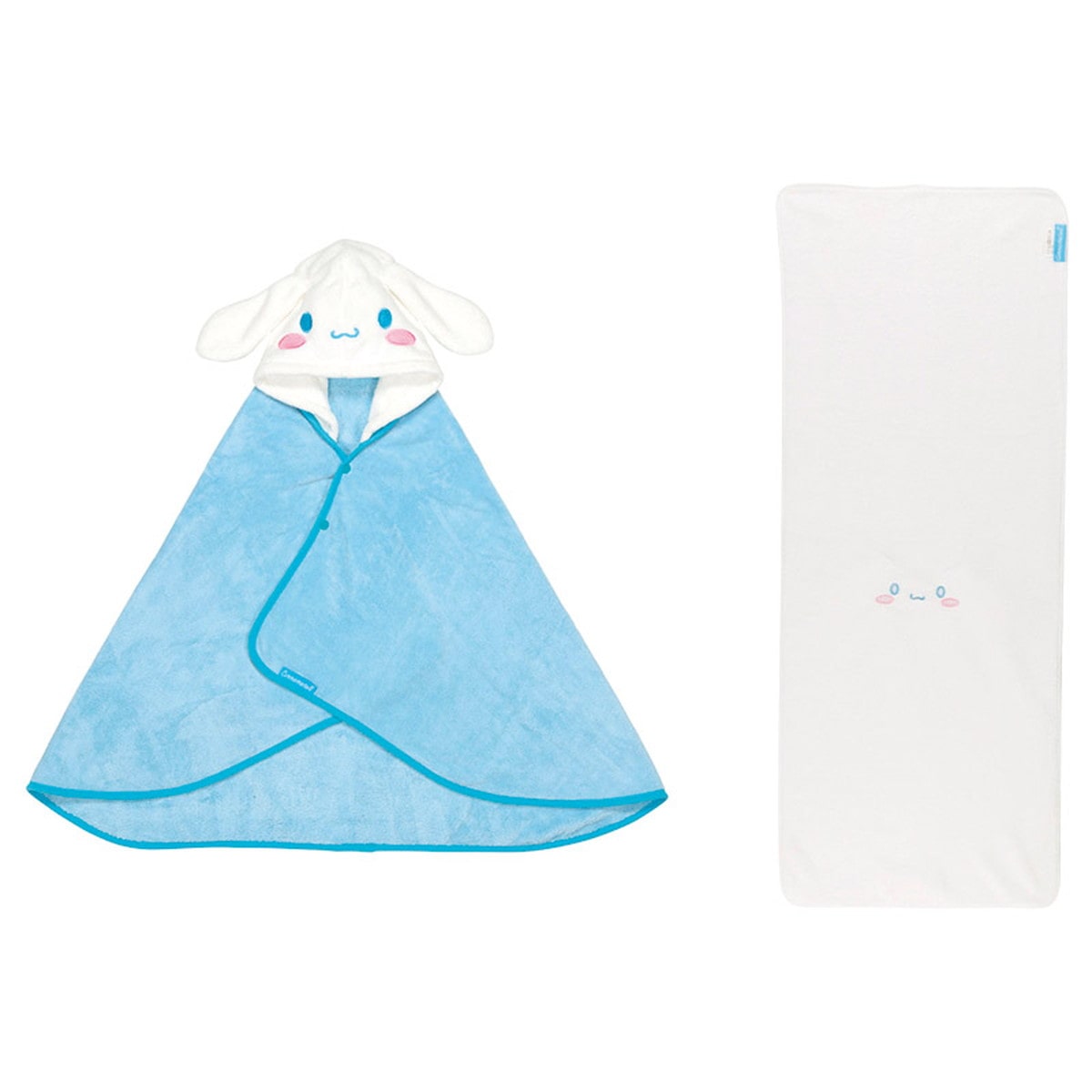 「吸水速乾タオルセット シナモロール 67481」 優しい肌触りのマイクロファイバー生地がしっかり吸収。吸水速乾素材のヘアドライタオルとフード付きバスポンチョのセット。