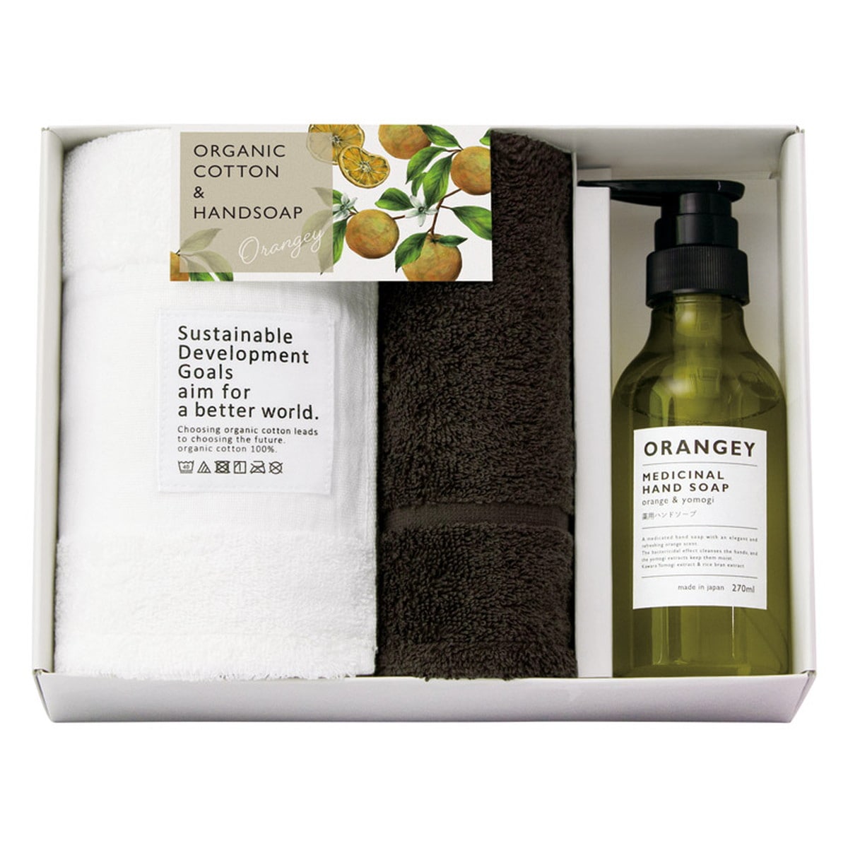 「オランジー 薬用ハンドソープとオーガニックタオルセット 19042」 オレンジ&ハーブのこだわりフレーバーがふわっと香るハンドソープとオーガニックコットンタオルのおしゃれでやさしいセットです。