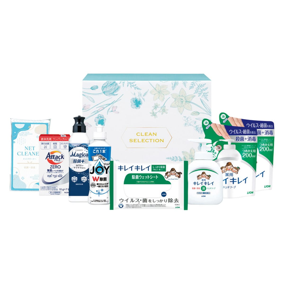●数量・内容:ライオンキレイキレイ薬用液体ハンドソープ(250ml)・ライオンキレイキレイ除菌ウェットシート(アルコールタイプ)(10枚)・P&G除菌ジョイコンパクト(170ml)・ライオンマジカ除菌プラス(220ml)・花王アタックZEROワンパック(7P)・ネットクリーナー(1P)×各1、ライオンキレイキレイ薬用液体ハンドソープ詰め替え(200ml)×2